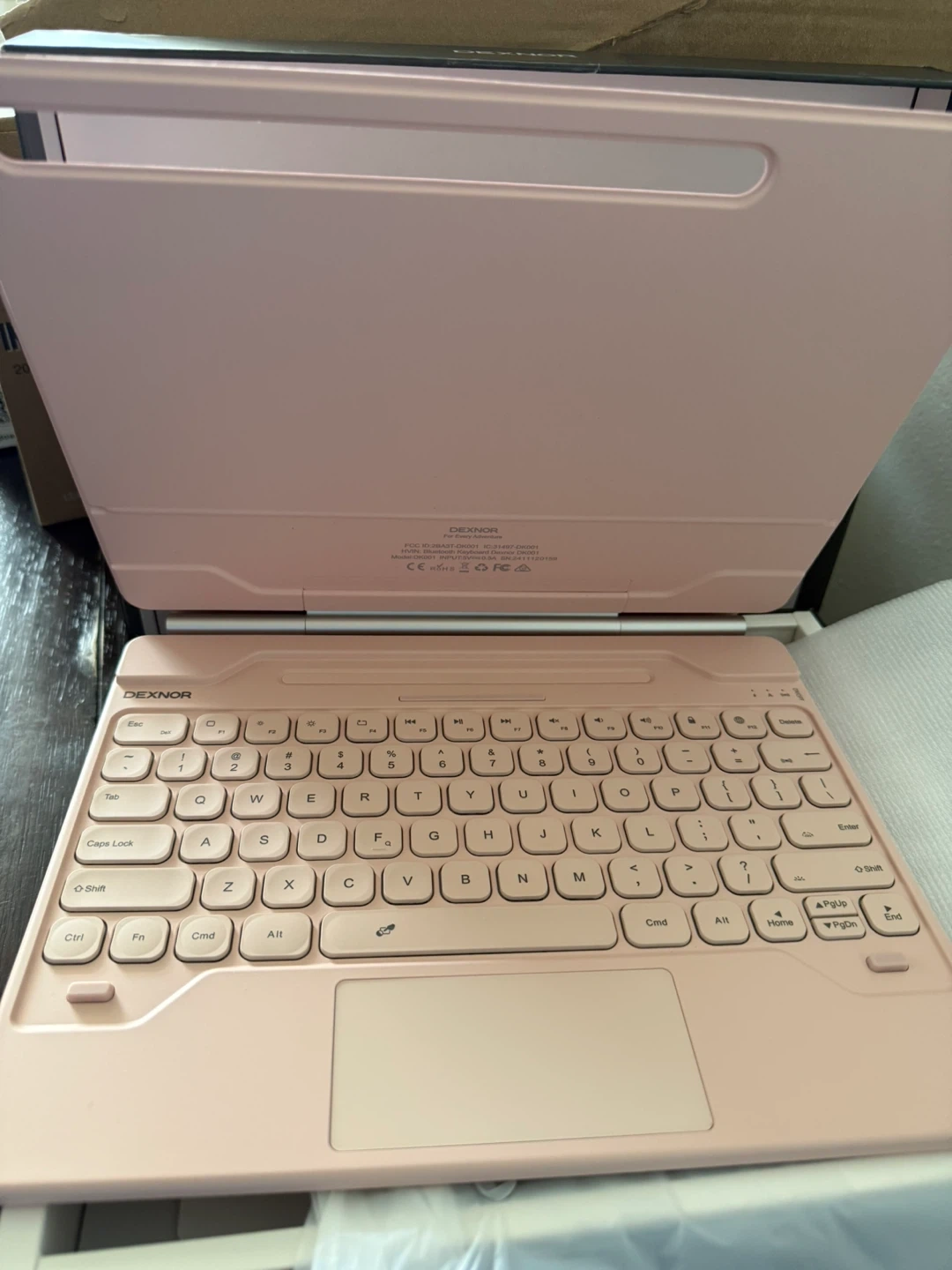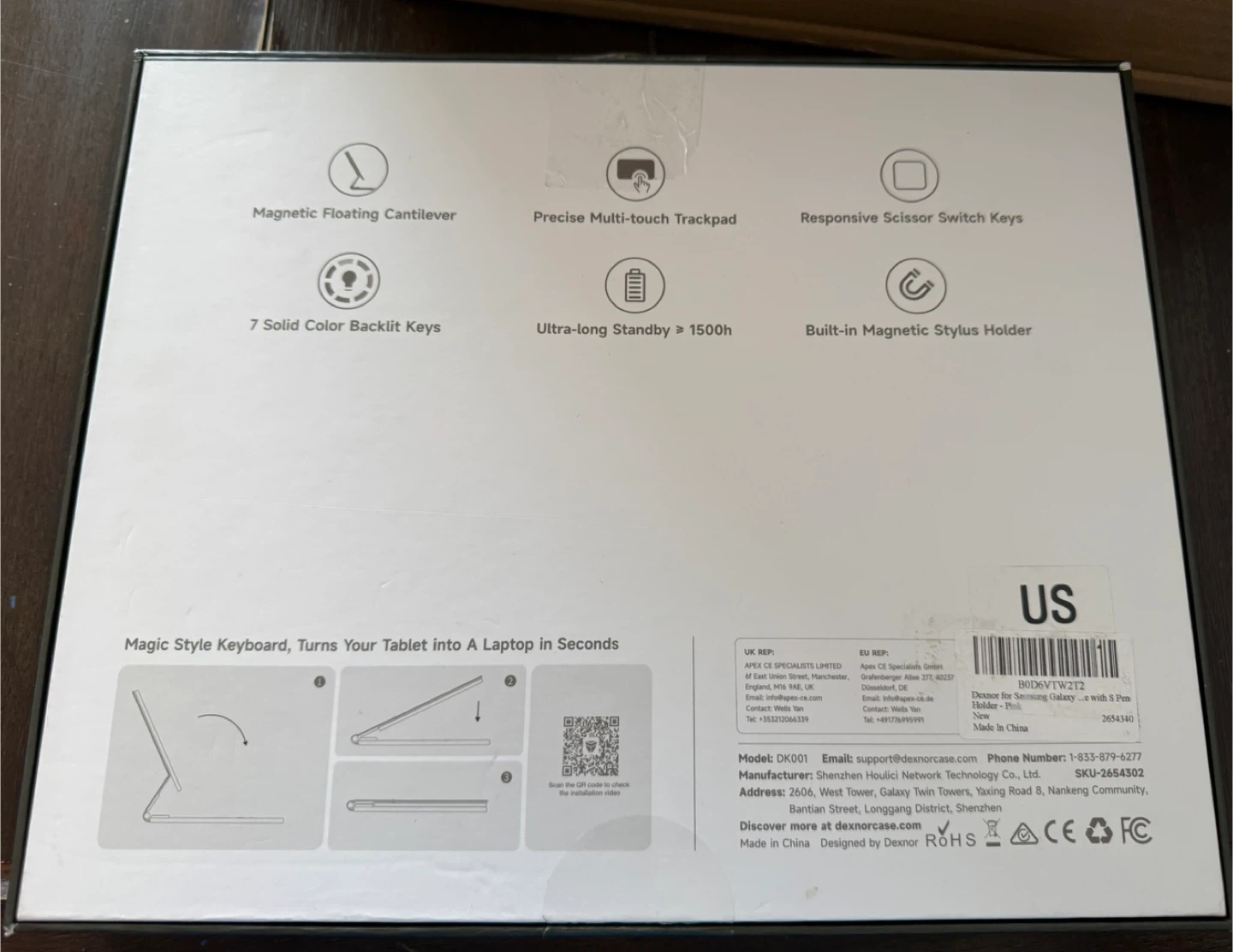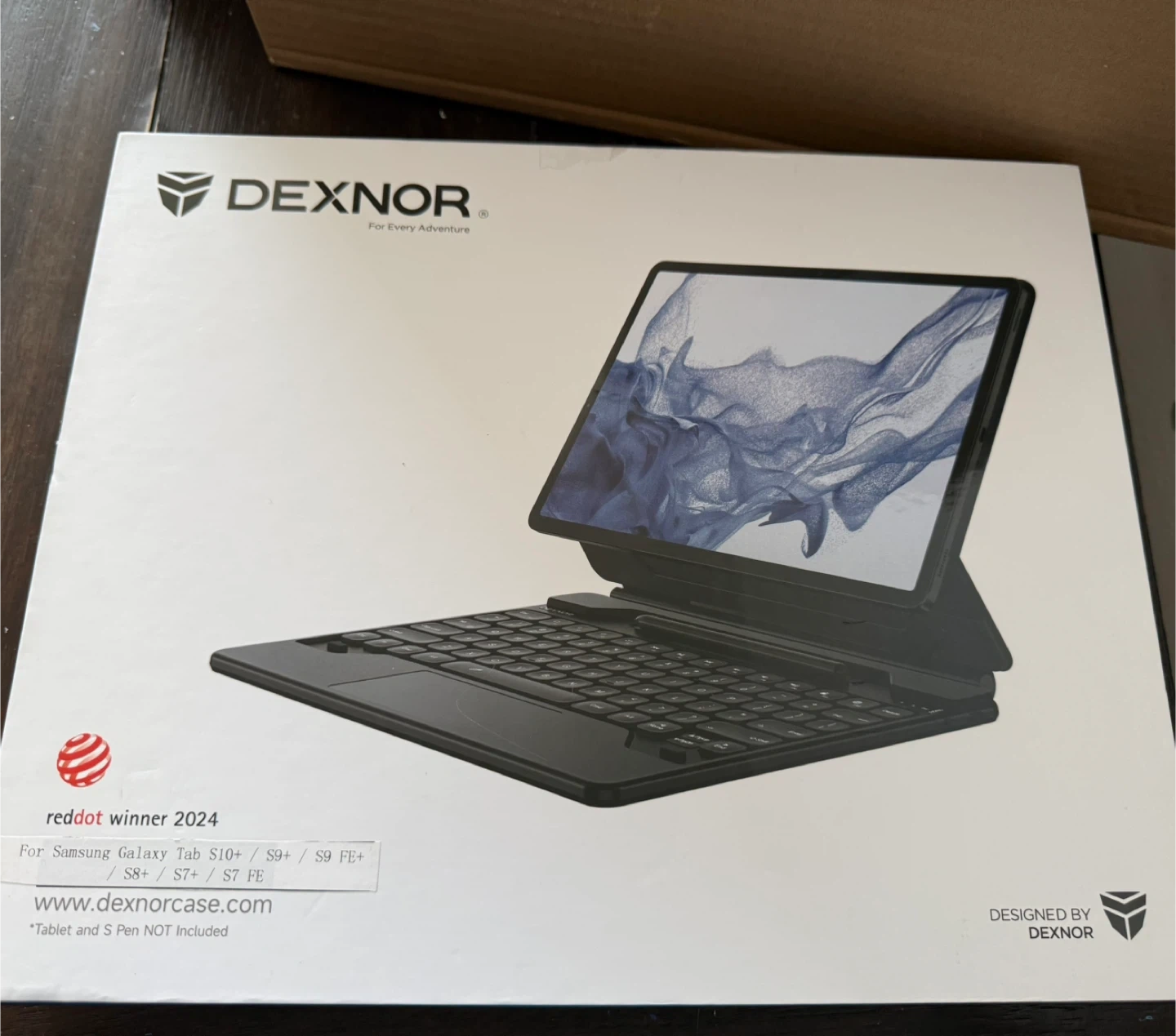 This DEXNOR keyboard case transforms your tablet into a laptop. It features a magnetic floating cantilever design and a precise multi-touch trackpad. The case also includes 7 solid color backlit keys and a built-in magnetic stylus holder. It's designed for extended use with over 1500 hours of standby time.
