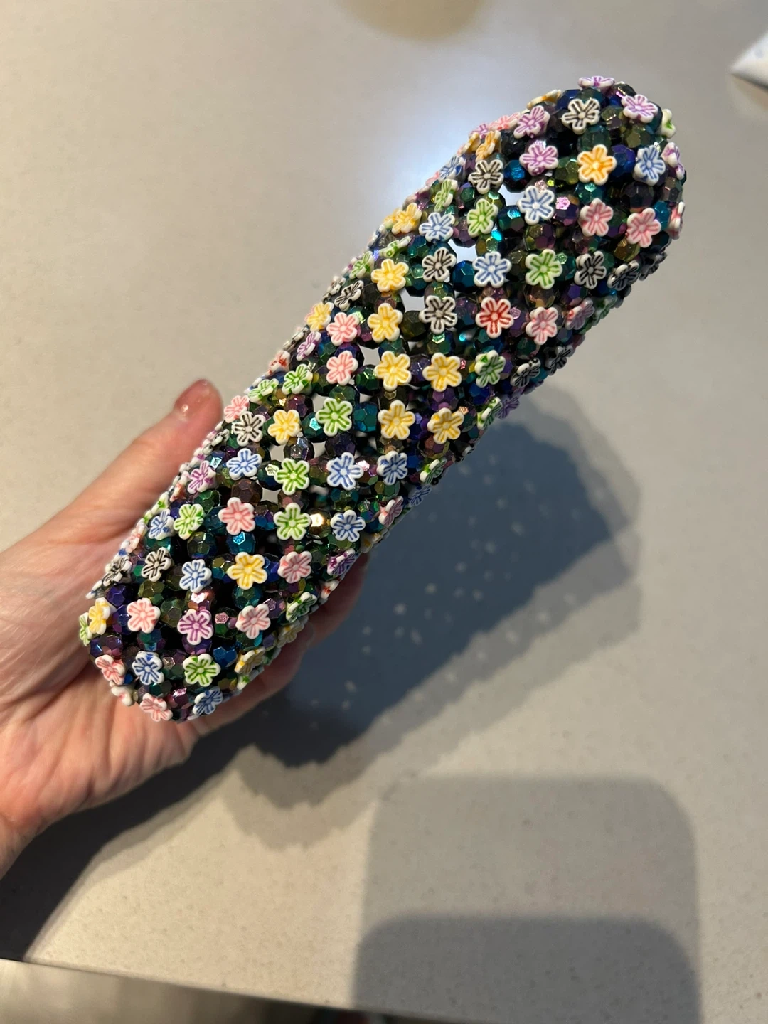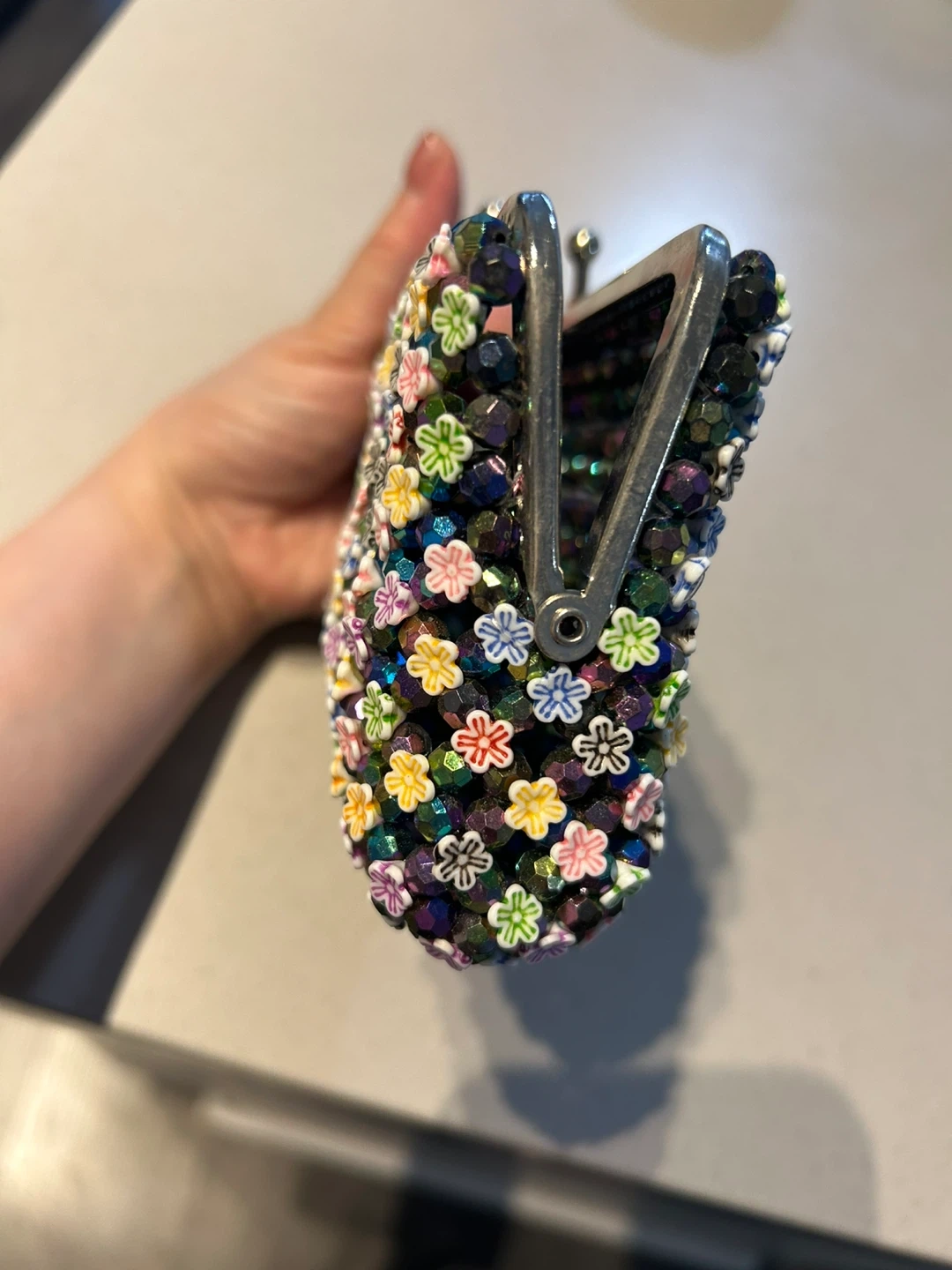 This is a fun beaded clutch purse with a colourful floral design and a kiss-lock closure. It's perfect for a night out or special occasion!