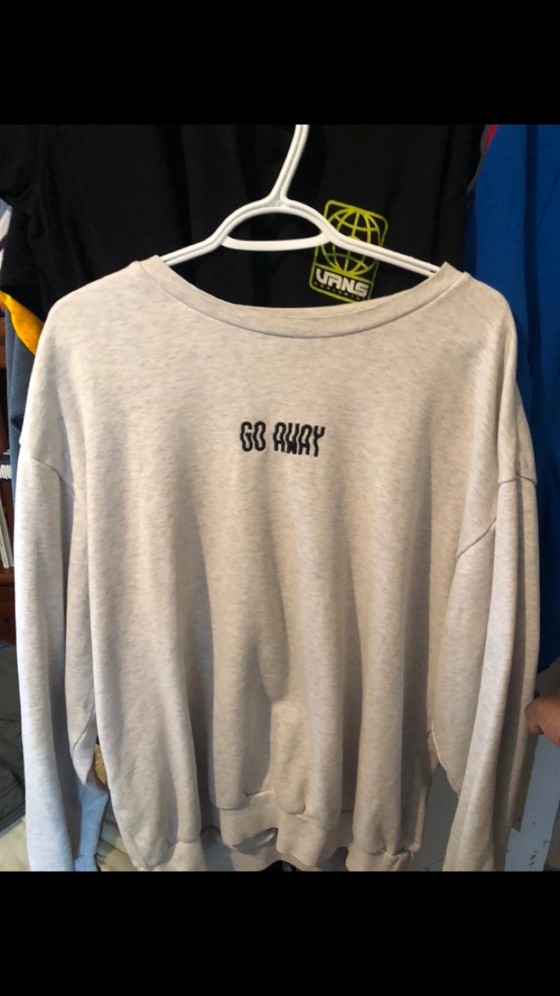 This light grey crewneck sweatshirt has "GO AWAY" embroidered on the front. It's made of a soft, comfortable fabric. Great for a relaxed look!