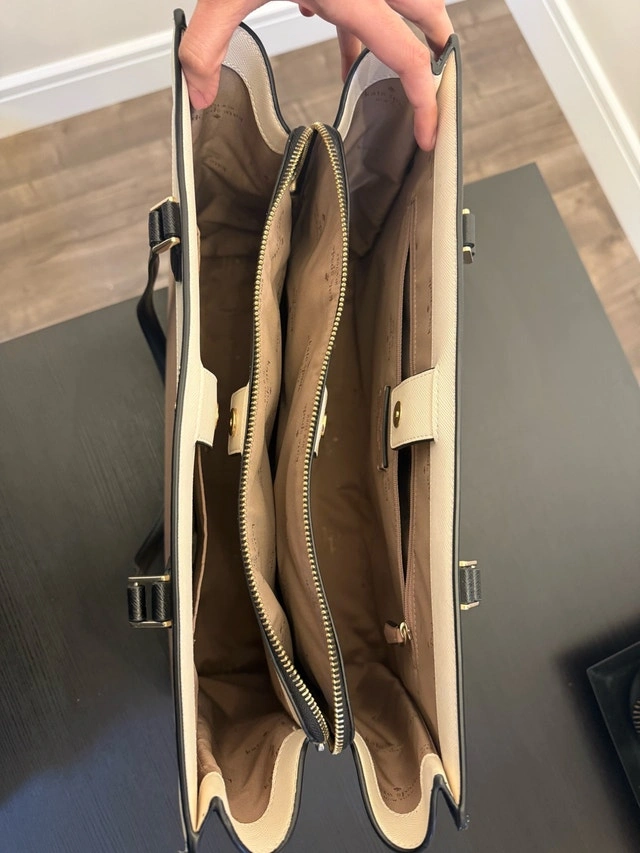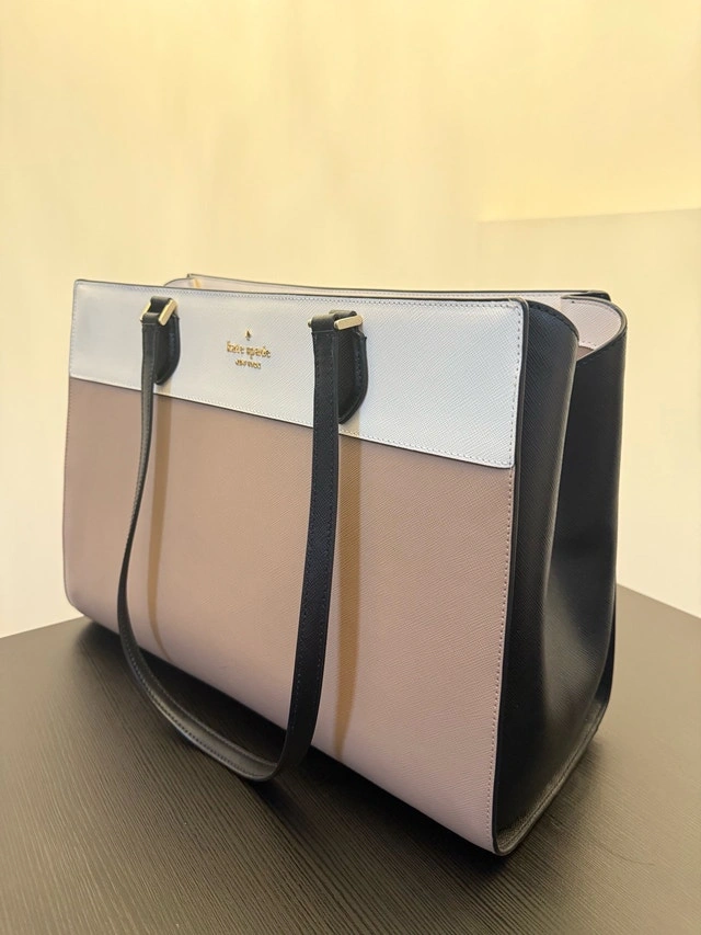 Kate Spade New York Madison Colorblock Saffiano Leather East West Laptop Tote. Original price: $359. Selling price: $340. Spacious interior fits laptop, documents, and essentials. Features a sturdy double shoulder strap. Neutral colors match any outfit. Gently used and well cared for. No major flaws. From a smoke-free home. Great for office, travel, or daily errands.