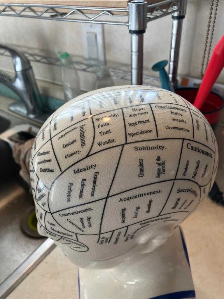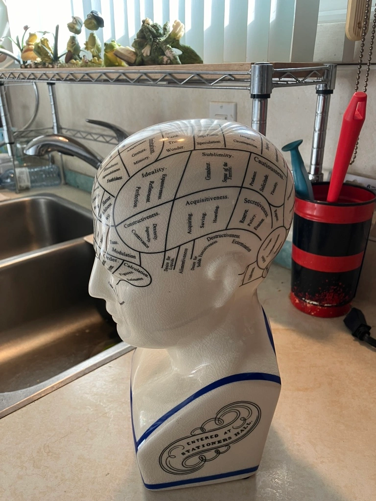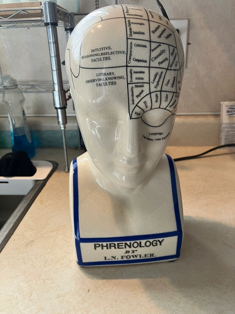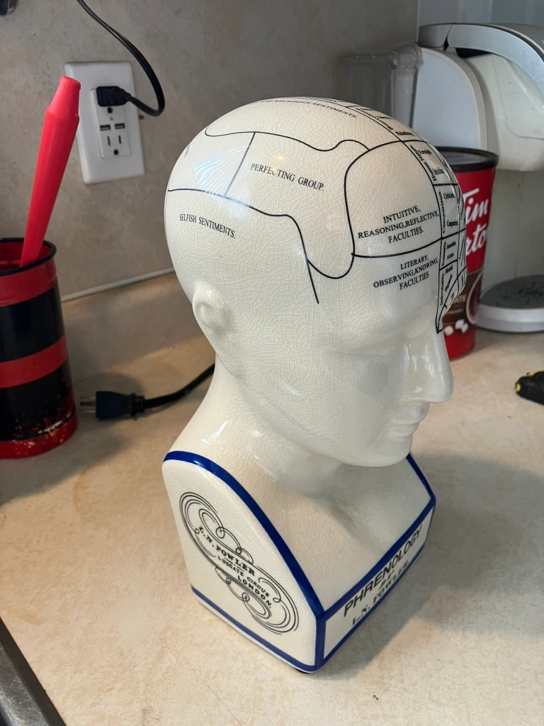 Ceramic bust with markings identifying phrenological traits. The bust is marked L.N. Fowler. Please take a look at more of my stuff. I am going through my mom’s and grandma’s stuff slowly every day.