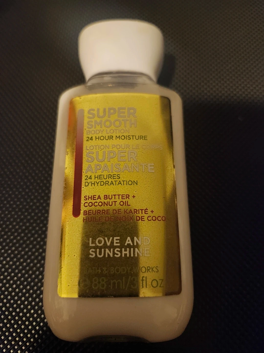 Bath & Body Works Super Smooth body lotion in Love and Sunshine scent. It's 24-hour moisture with shea butter and coconut oil. 88 ml/3 fl oz.