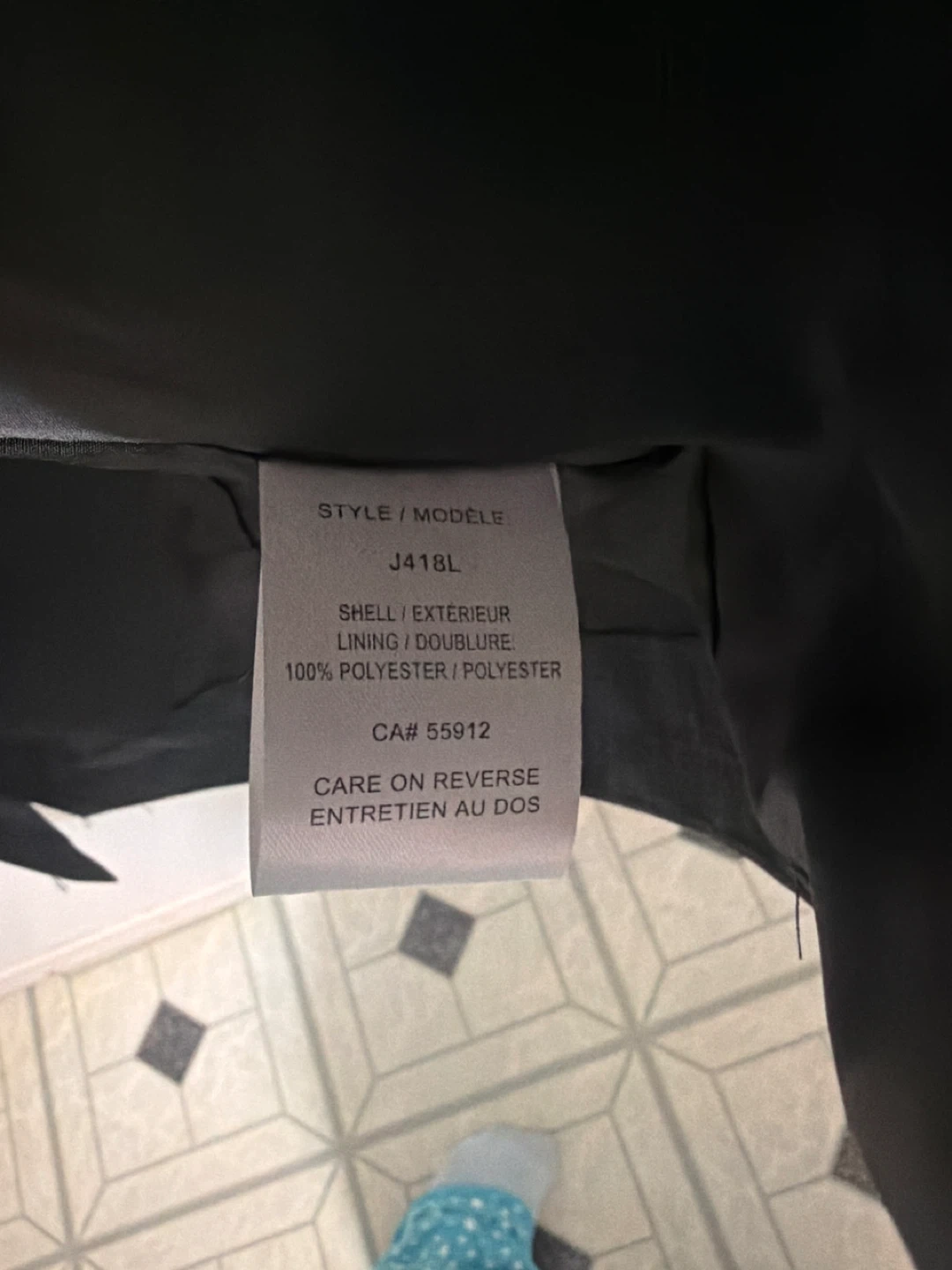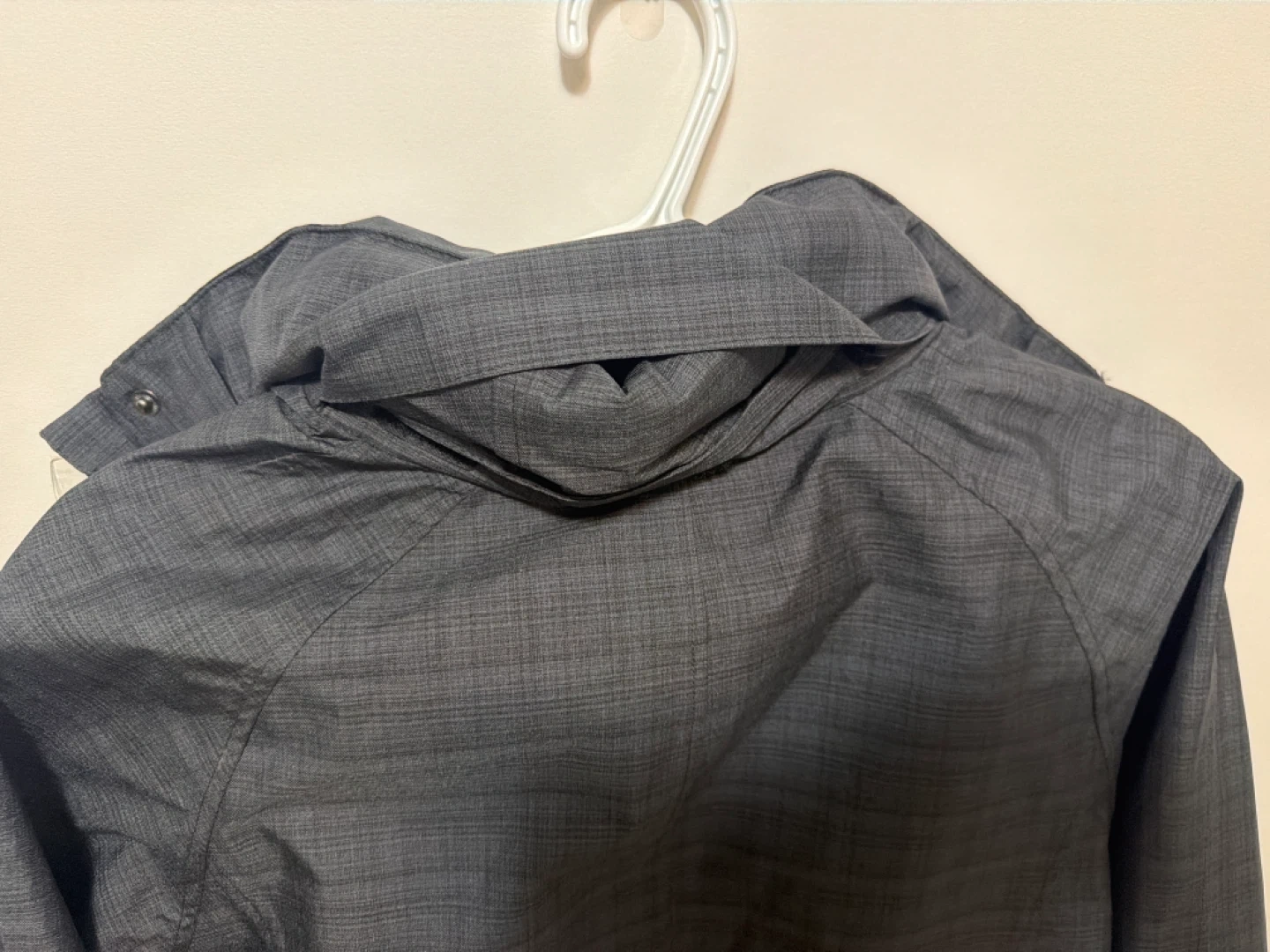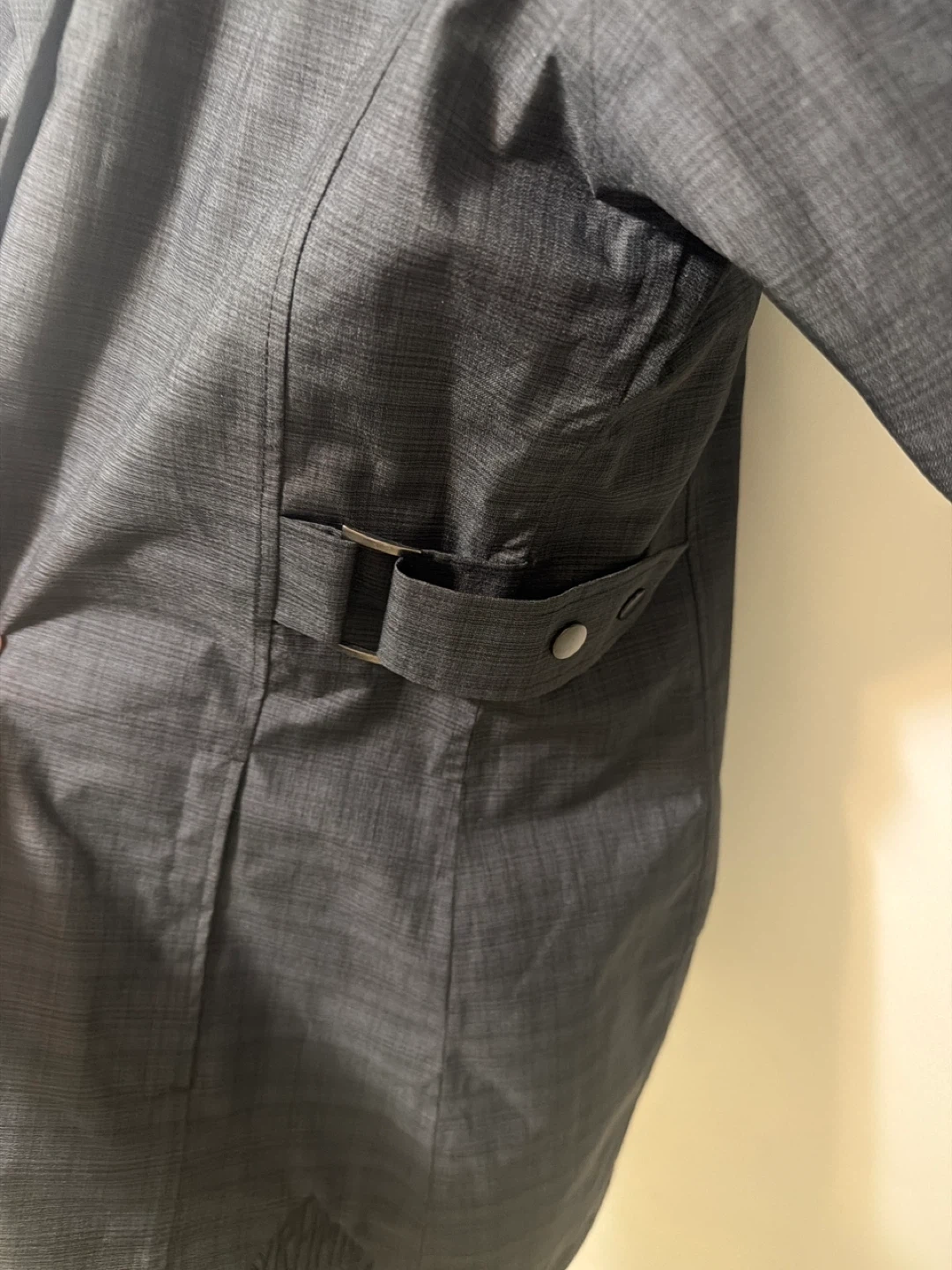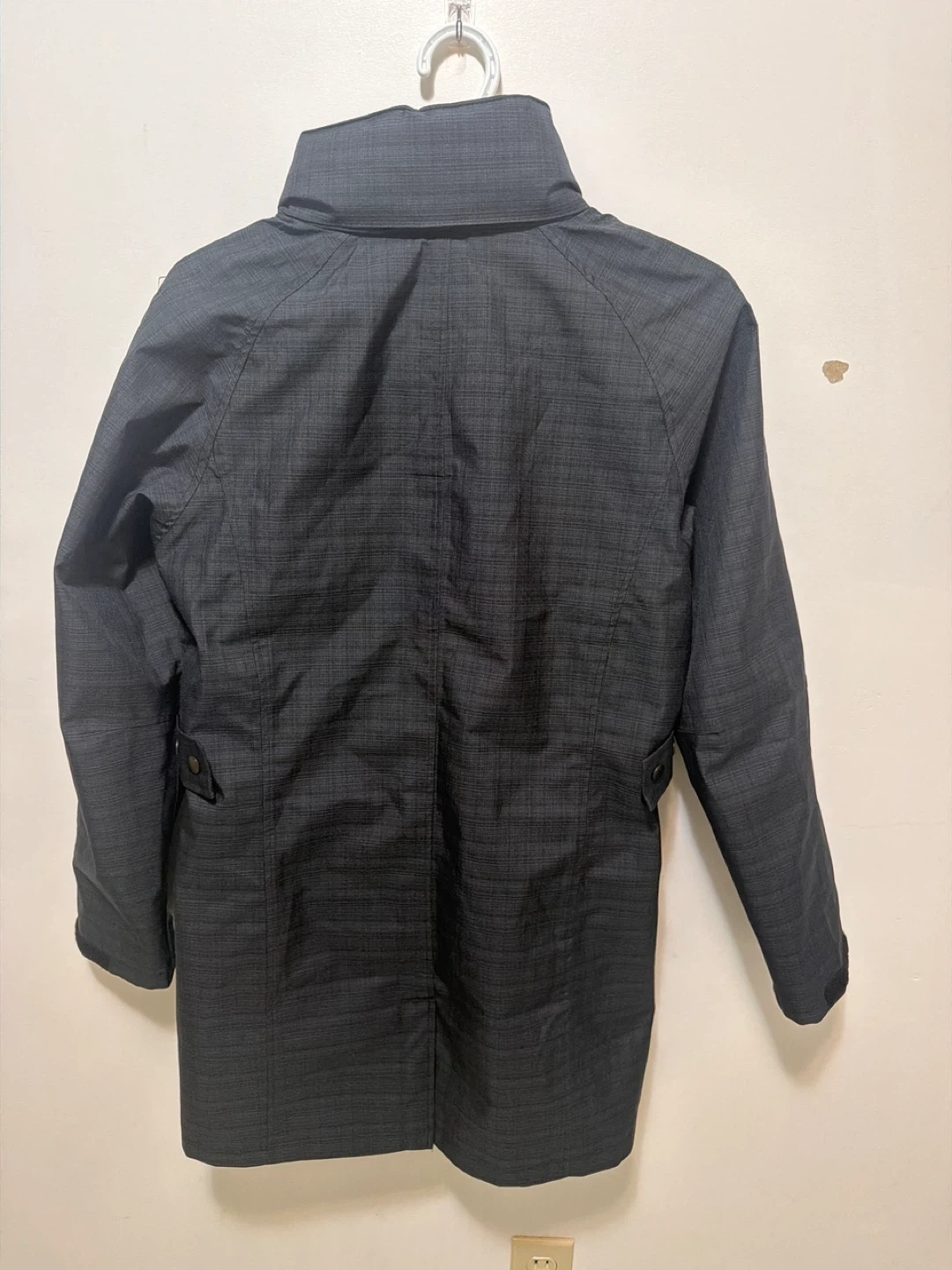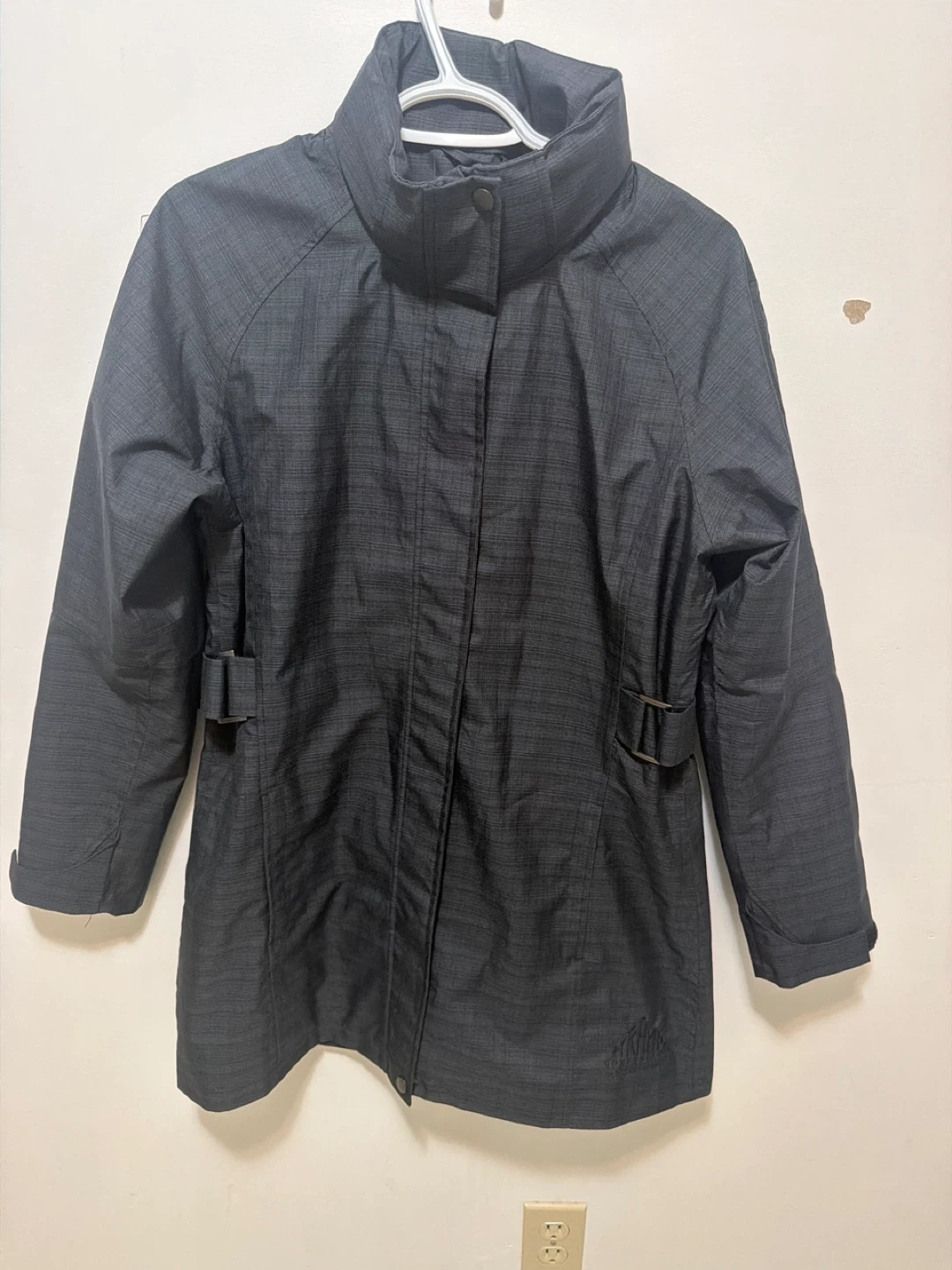This Biz Collection ladies rain jacket is a size medium. It's a dark grey with a subtle textured pattern. Features adjustable tab details on the sides and a hood tucked inside the collar.