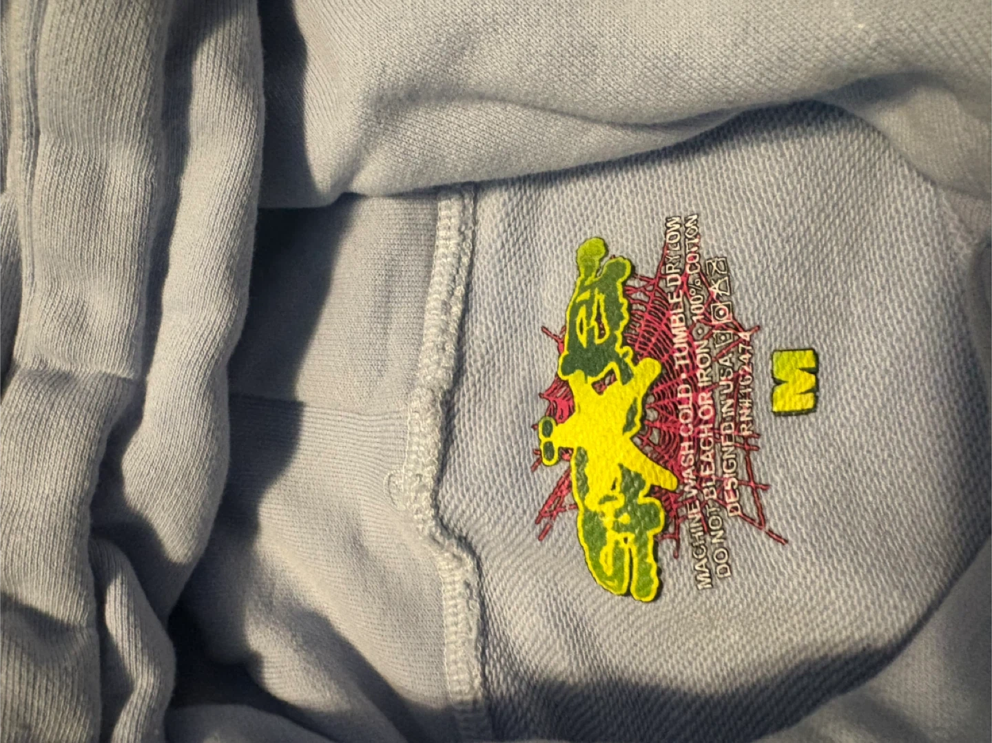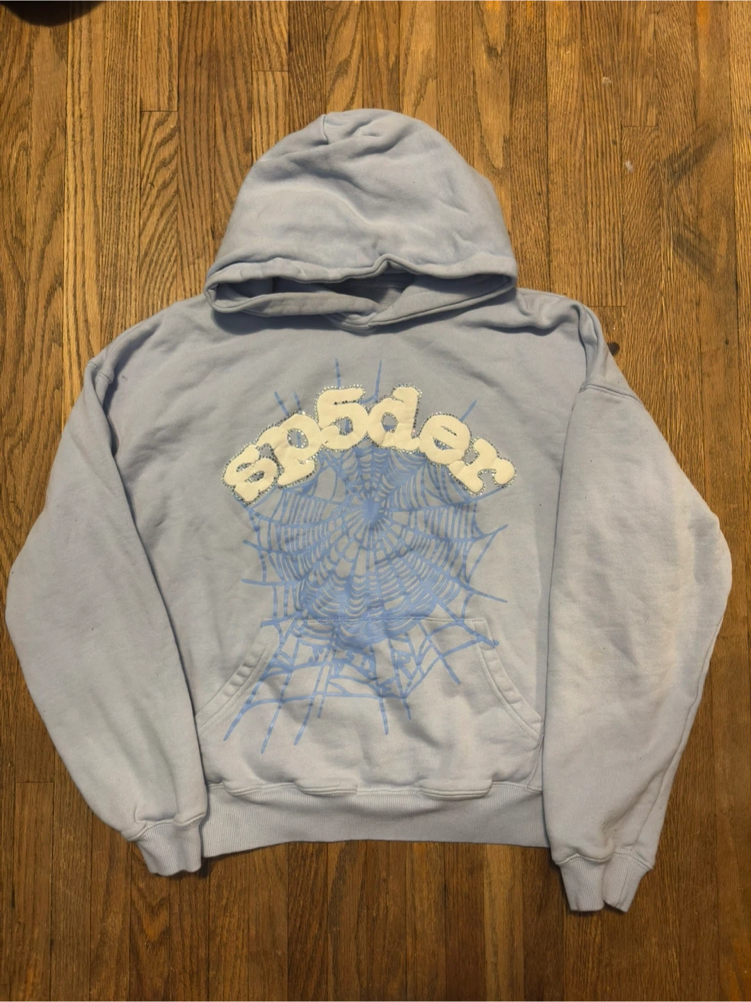 Selling a Spider Worldwide hoodie, says medium, fits small. light blue colour with a spiderweb design on the front. Made of 100% cotton. Machine wash cold, tumble dry low. Do not bleach or iron
