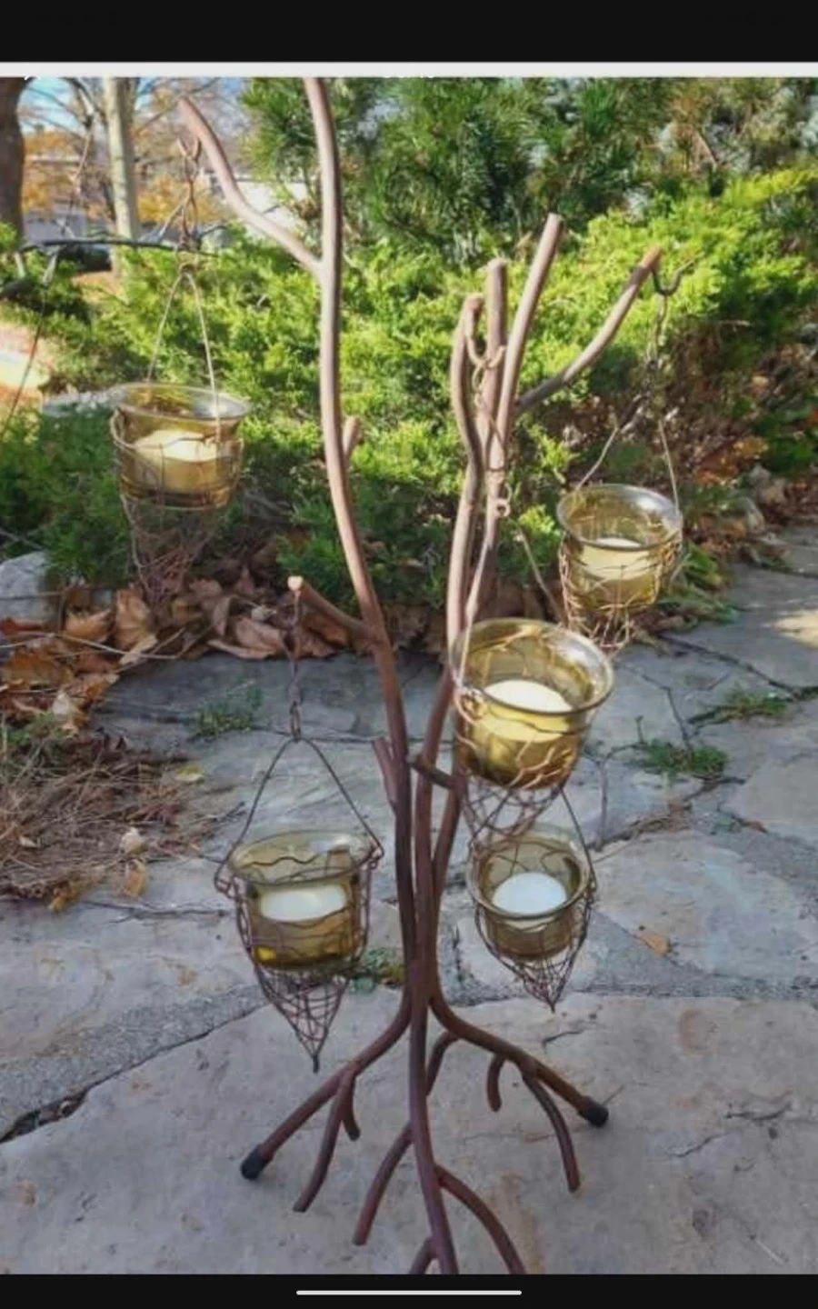 This rustic candelabra centerpiece features a tree branch design with hanging glass candle holders. Each holder has a wire cage detail. It's perfect for adding a charming, natural touch to event decor.