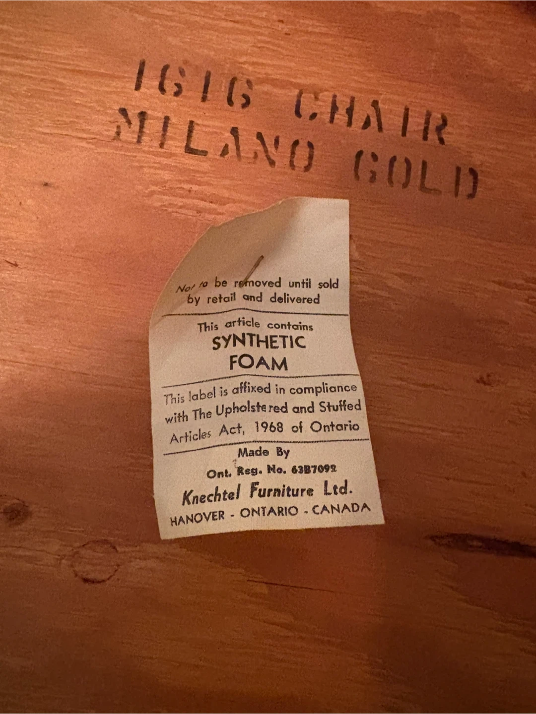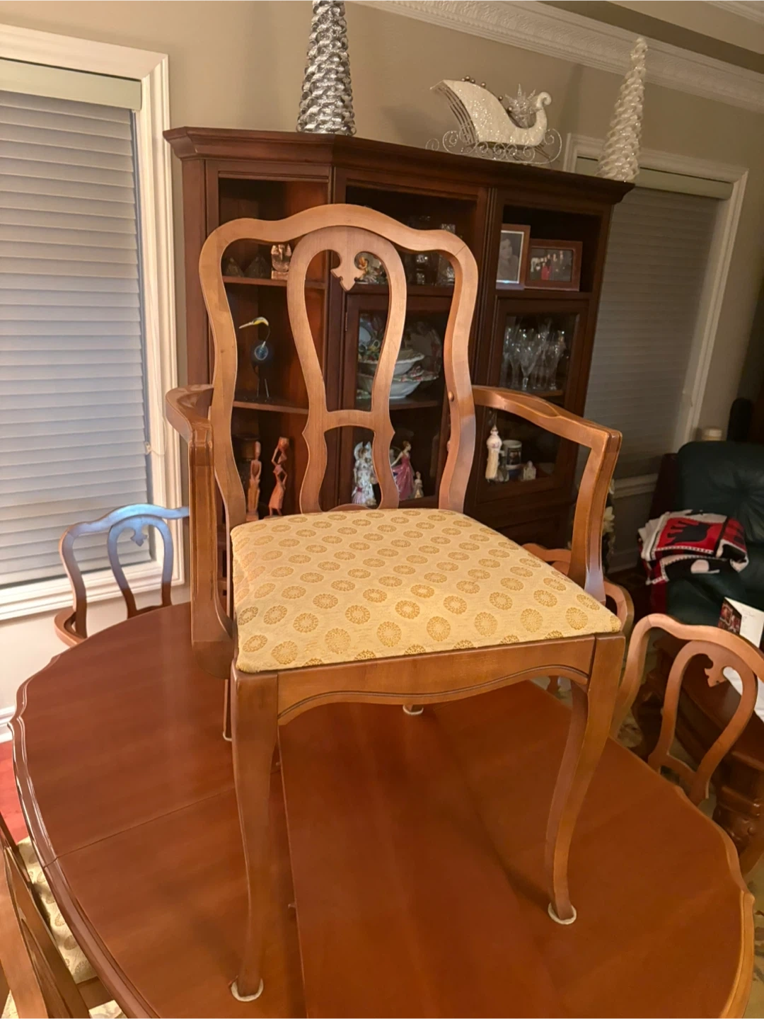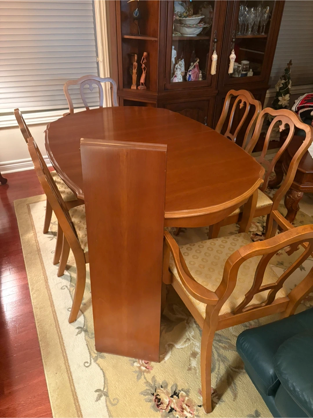 This dining set includes an oval-shaped wooden table with a fruitwood finish and six upholstered chairs. The chairs have a subtle gold patterned fabric and are made with synthetic foam. Made by Knechtel Furniture Ltd. in Ontario, Canada.