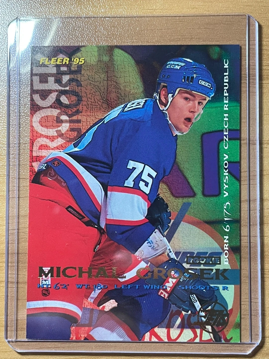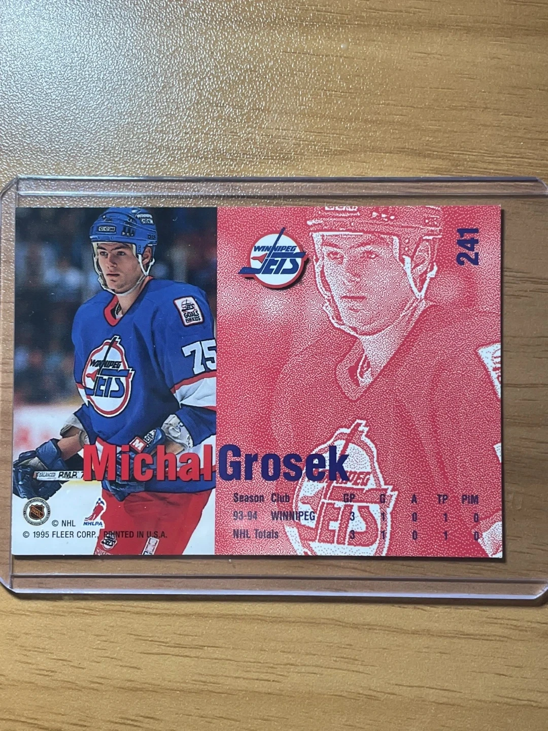 This is a 1995 Fleer hockey card featuring Michal Grosek of the Winnipeg Jets. The card shows his player stats and action shots. It's a collectible item for hockey fans.