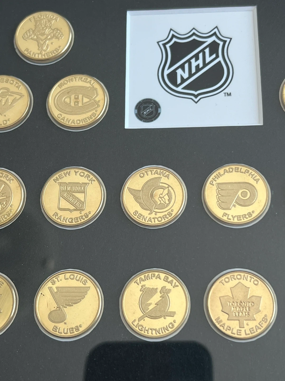 This framed display features 30 gold-tone discs, each showcasing a different NHL team logo. Includes a central NHL shield. It's a great piece for any hockey fan!