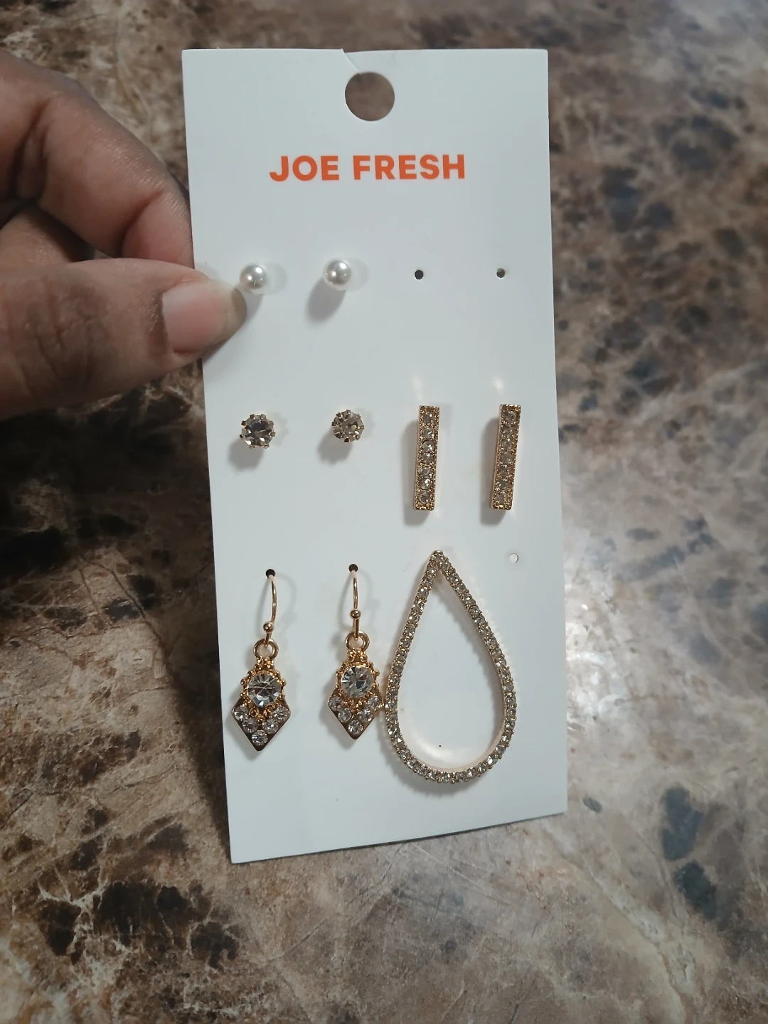 This is a set of three pairs of earrings from Joe Fresh. It includes pearl studs, jeweled studs, and gold-toned drop earrings with rhinestones. A great way to accessorize for different occasions! Price is firm plz. Pick up midland and Danforth or 401 bay street