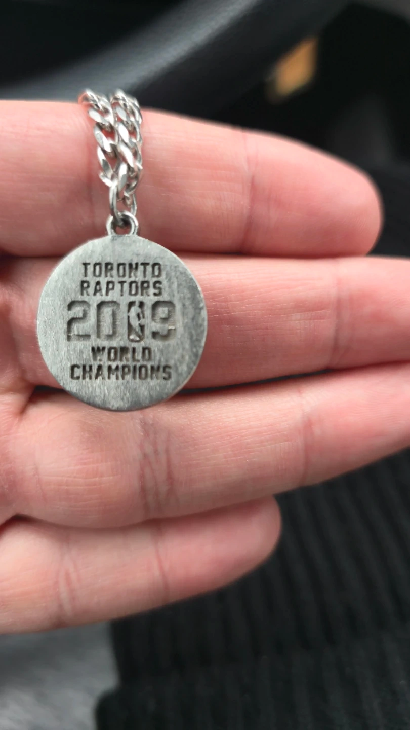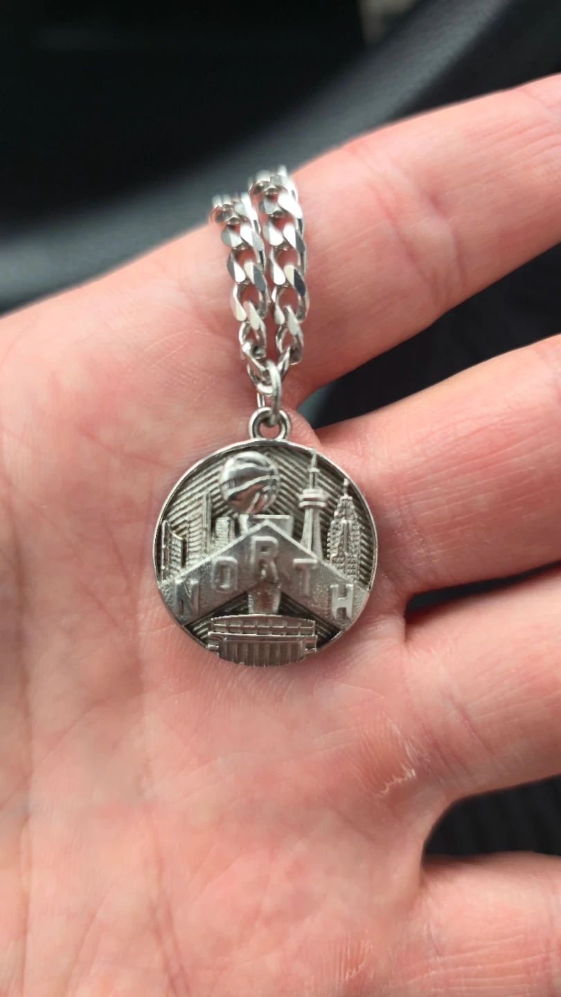 This is a pendant commemorates the Toronto Raptors 2019 World Champions. It's made of sterling silver and features "NORTH" on the front with a cityscape design. The back reads "TORONTO RAPTORS 2019 WORLD CHAMPIONS". True collectors item and rare. Took 3 weeks to make this order and cost $215. Shoot me an offer!