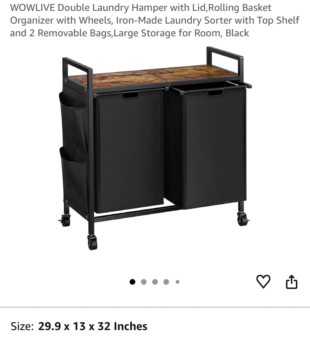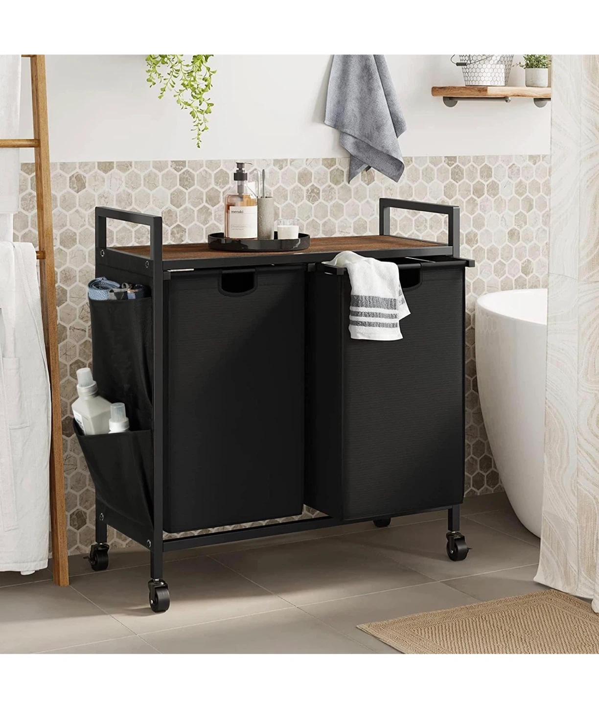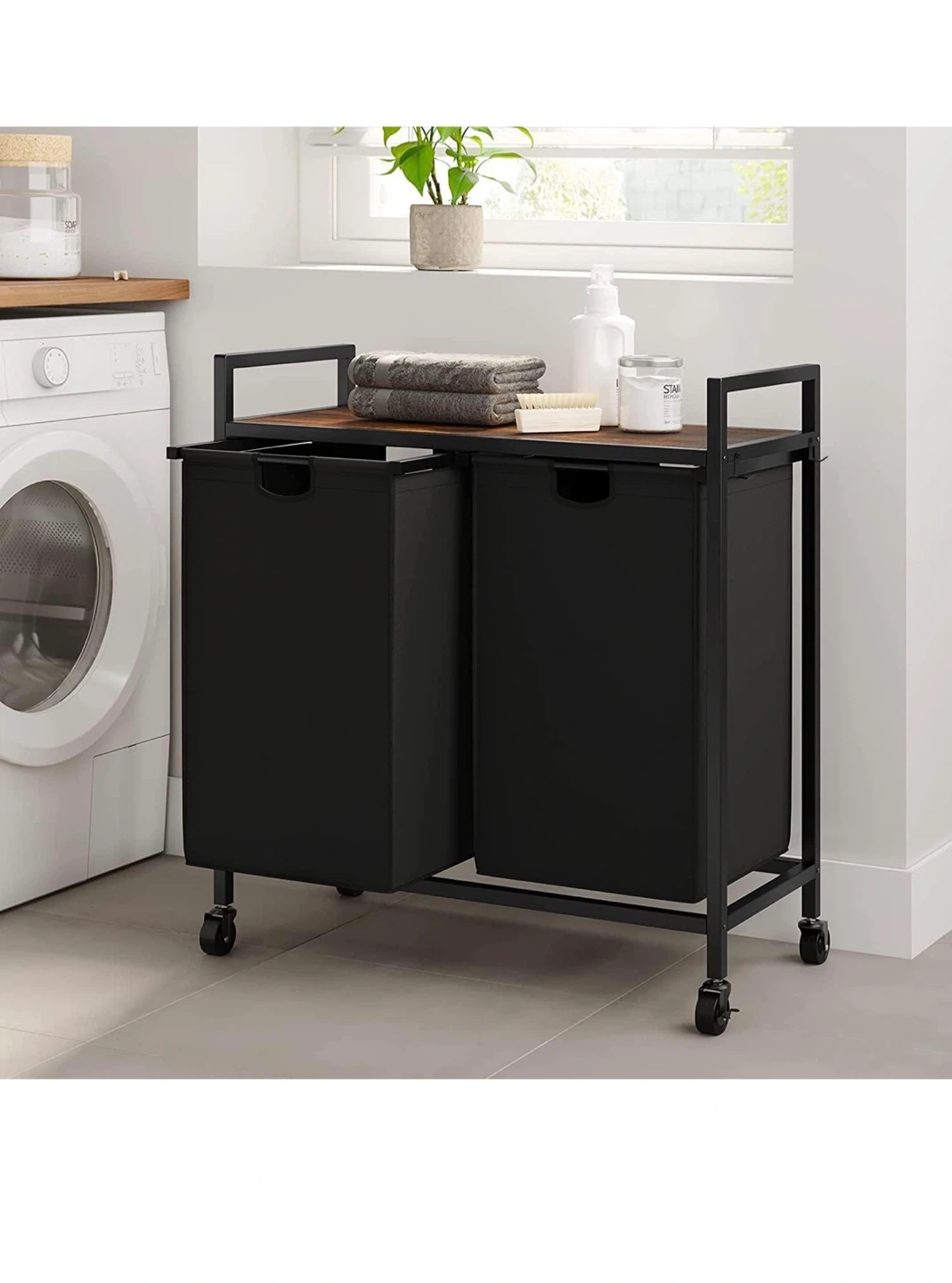 This double laundry hamper features two removable liner bags and a convenient top shelf. It's designed with wheels for easy mobility and offers a max capacity of 110 L. The frame is iron-made, and the bags are black fabric.
