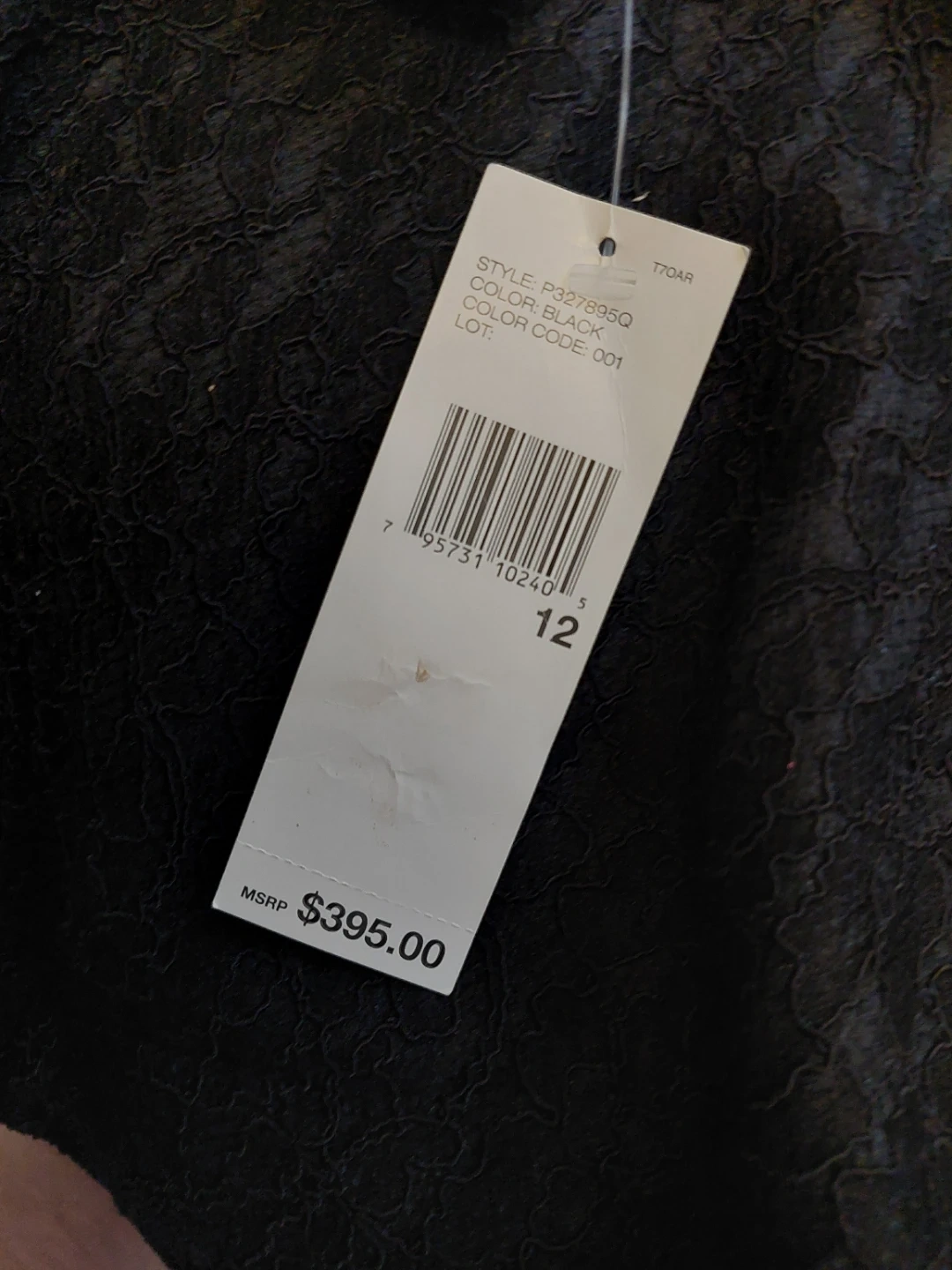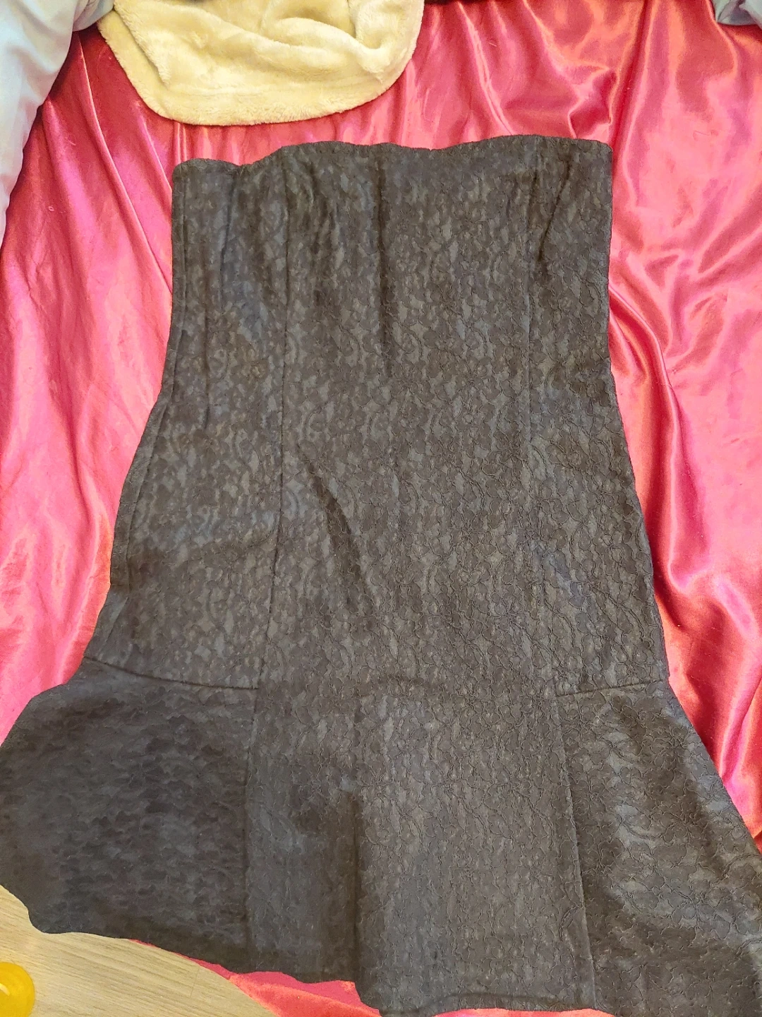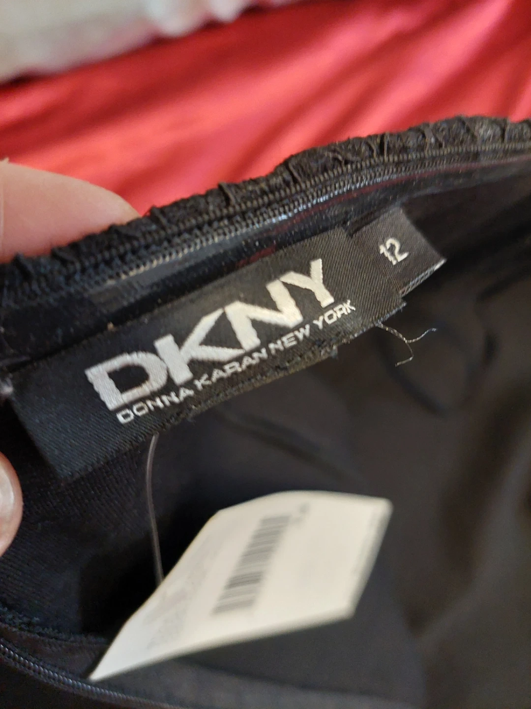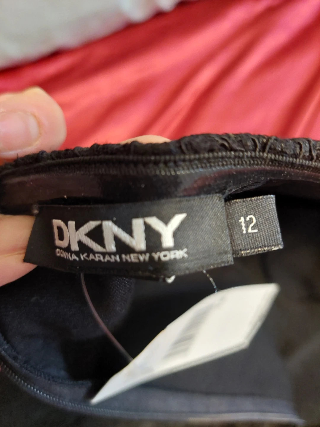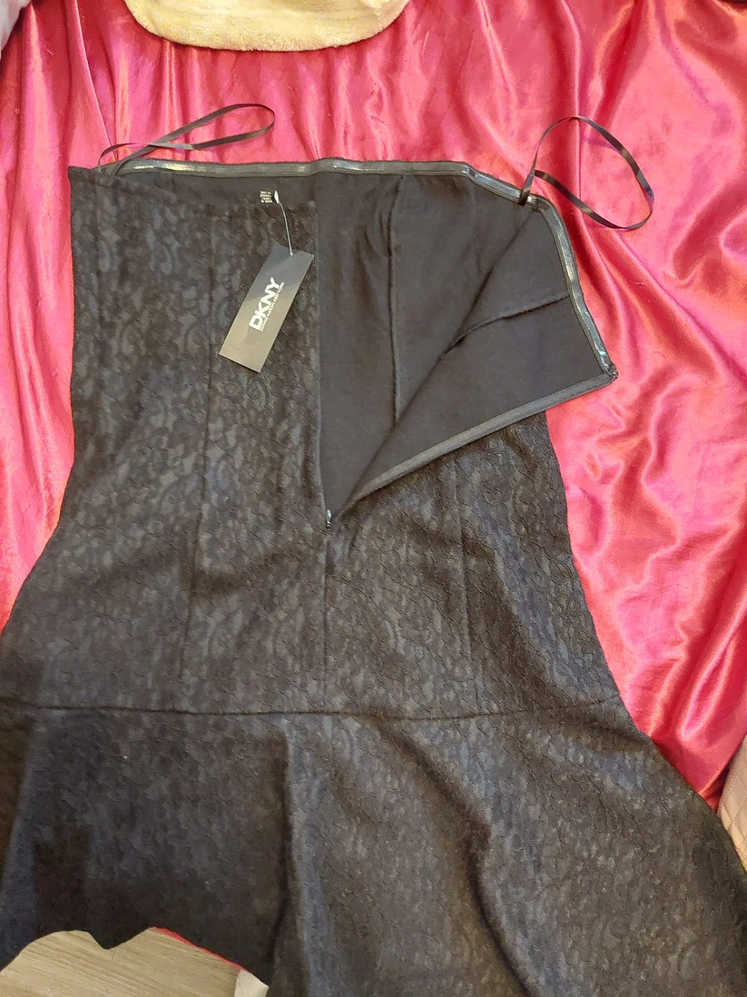 DKNY strapless dress with black lace overlay. It's a size 12 with a full lining. Zipper closure at the back.
