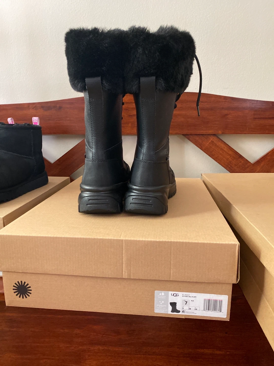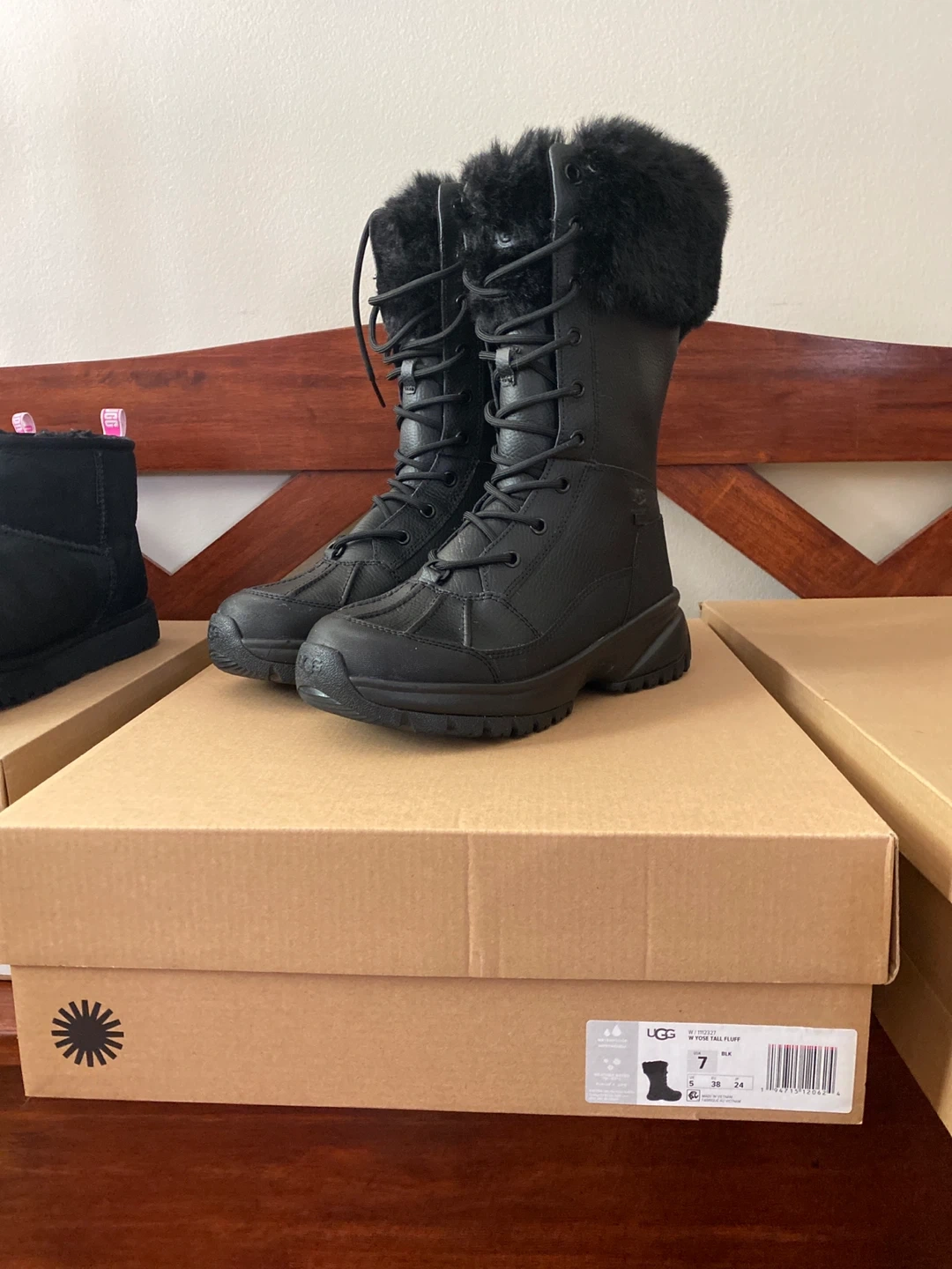 Selling a pair of UGG W Yose Tall Fluff boots in size 7. They are black and new . The boots come with the original box.