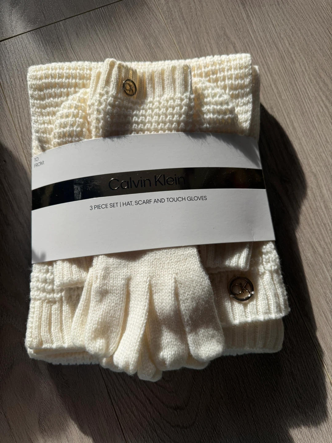 Selling a brand new Calvin Klein 3-piece set including a hat, scarf, and touch gloves! The set is a beautiful cream colour and would make a lovely gift for someone as Christmas present.