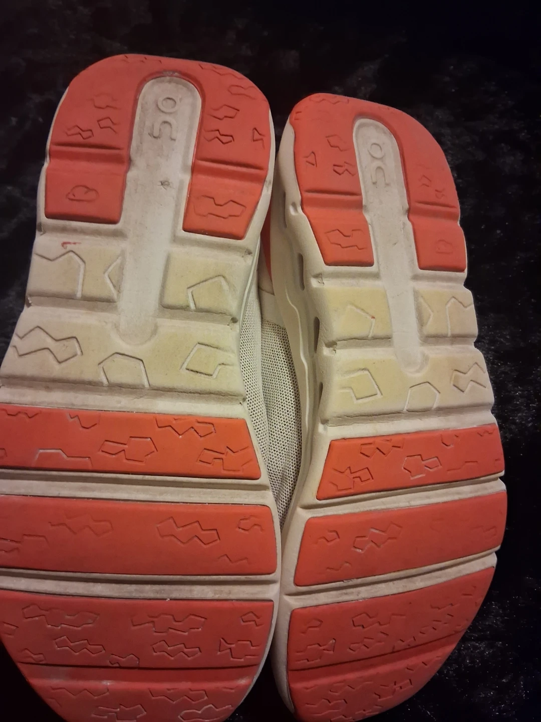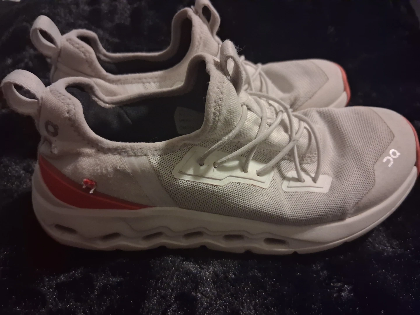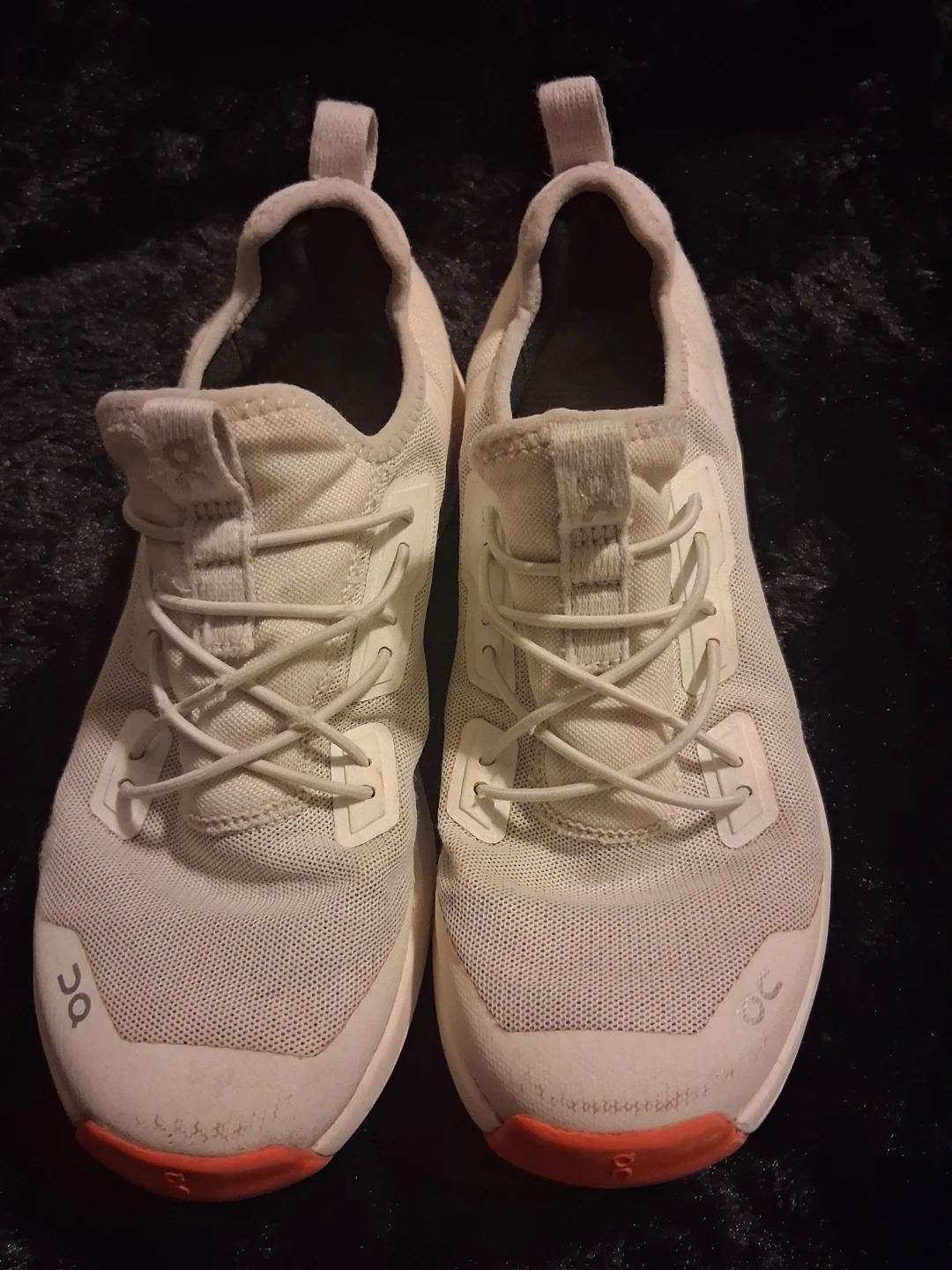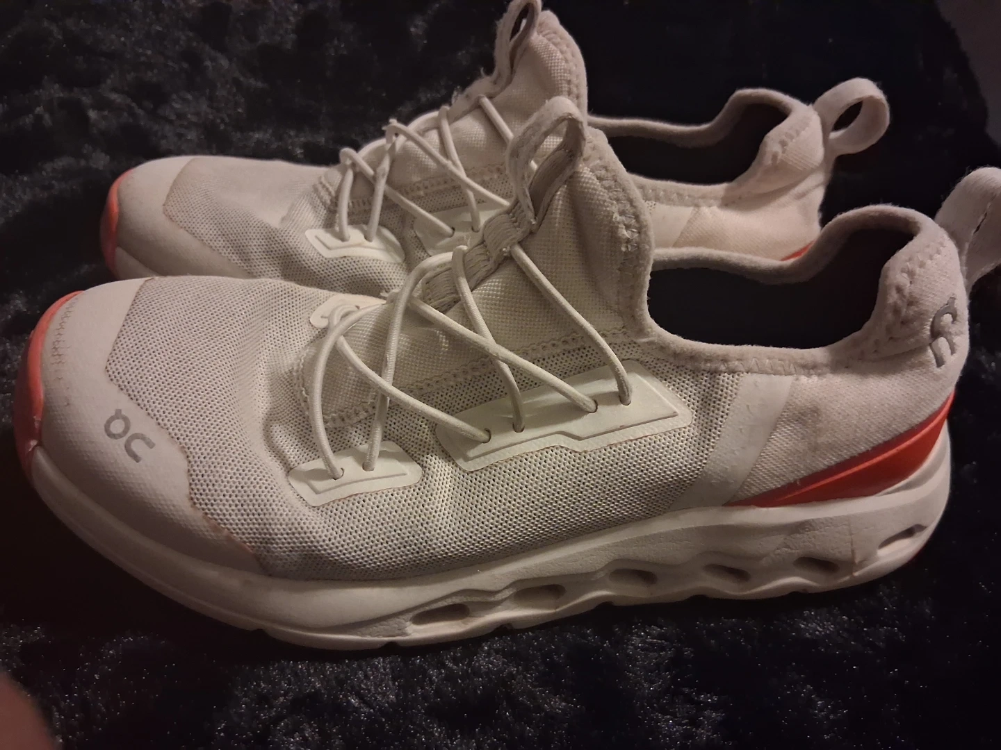 These On running shoes are white with coral accents. They feature a breathable mesh upper and a unique sole design for comfort and performance. The shoes have a slip-on design with integrated lacing. Ideal for runners seeking a lightweight and responsive shoe!