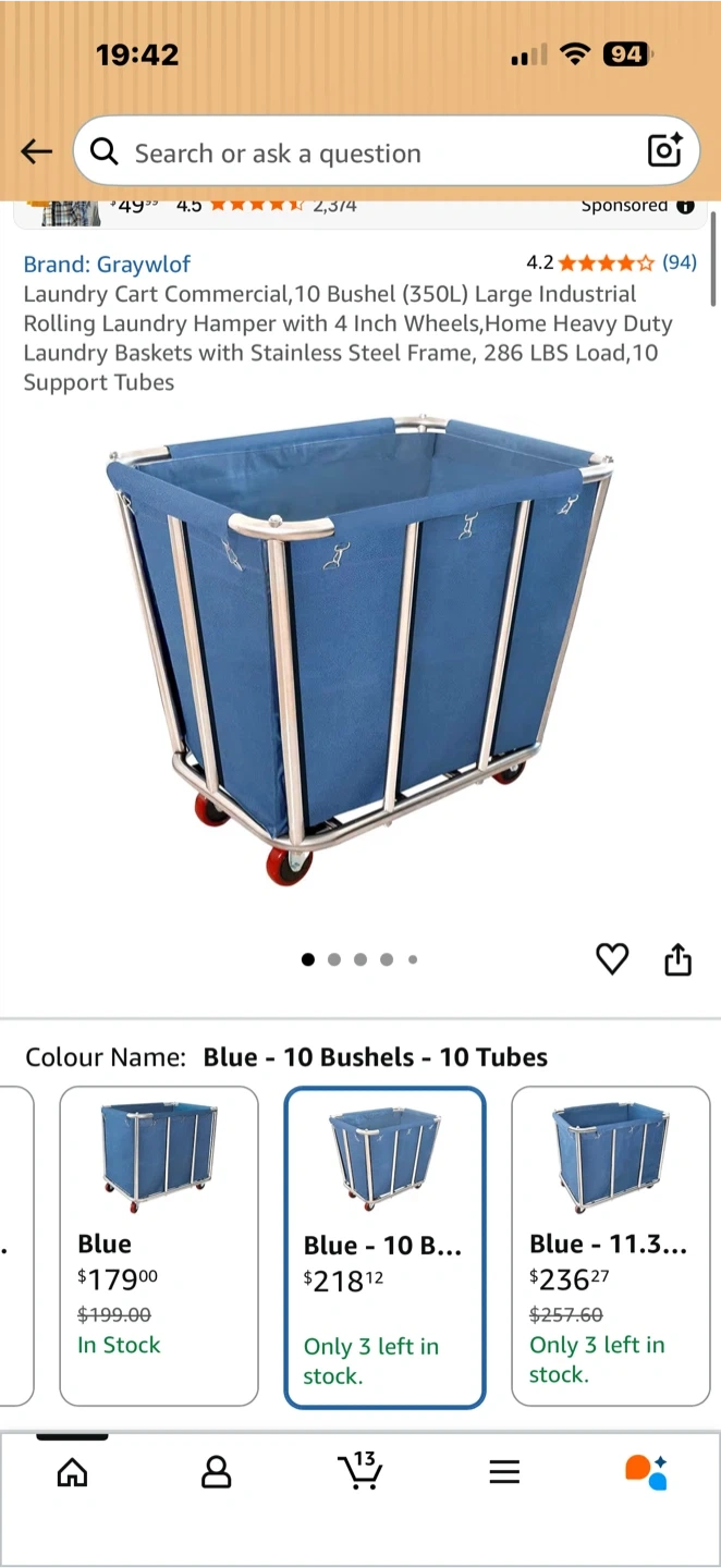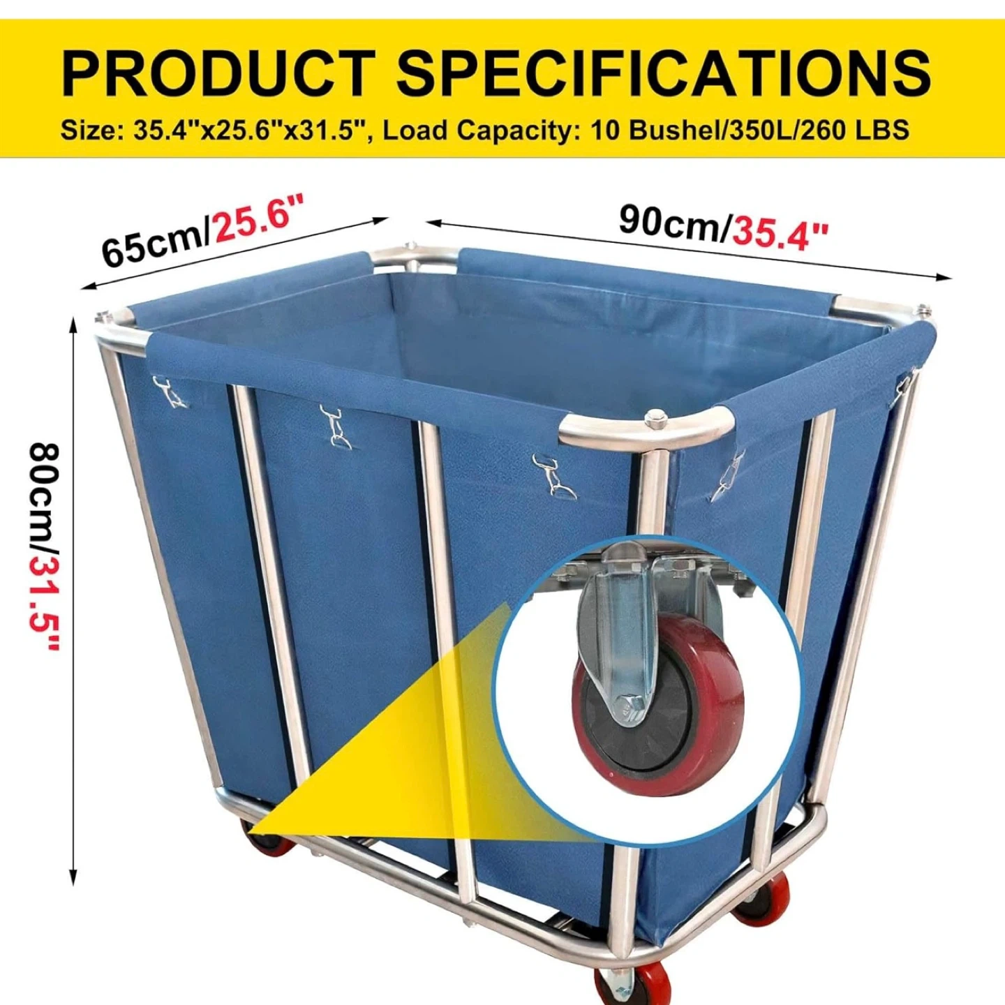 Laundry Cart Commercial,10 Bushel (350L) Large Industrial Rolling Laundry Hamper with 4 Inch Wheels,Home Heavy Duty Laundry Baskets with Stainless Steel Frame, 286 LBS Load,10 Support Tubes
