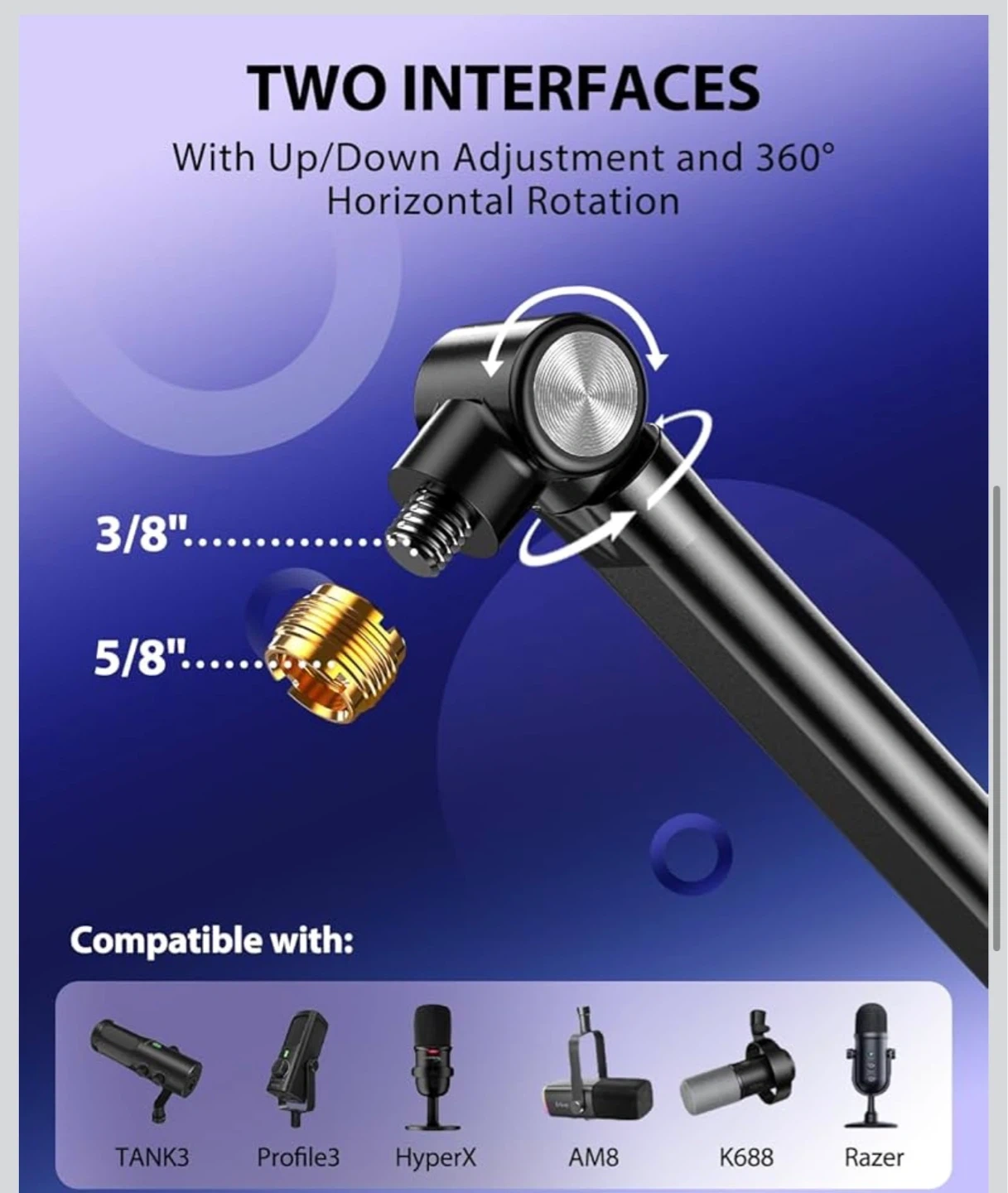 Microphone Boom Arm, Aluminum Alloy Mic Arm Stand for Blue Yeti, HyperX QuadCast, Shure SM7B and Other Mic, 360° Rotatable Head Mic Arm Desk Mount with 3/8" to 5/8" Adapter for Podcast Gaming
