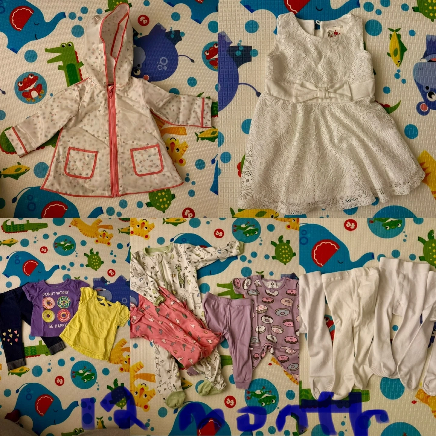 Size 12 months, gently used - look at both posted pictures, like new. A mixed bundle of baby girls' clothing in various styles. Includes onesies, pants, tops, a dress, and a jacket. Many pieces are soft cotton, perfect for everyday wear. Some items feature cute patterns and playful graphics!