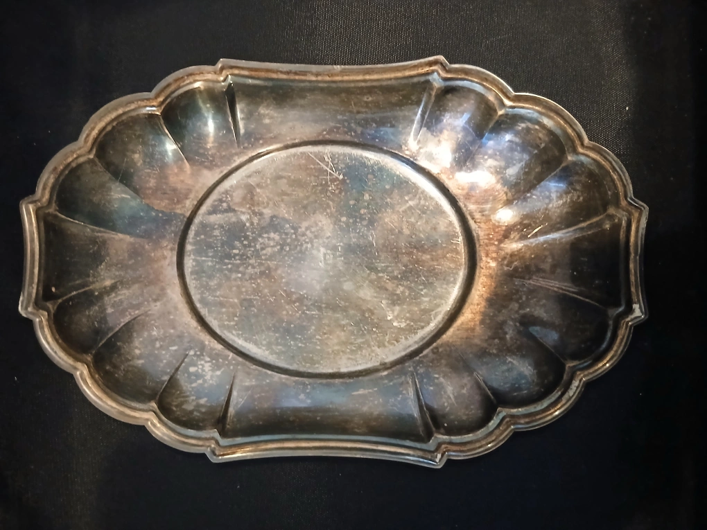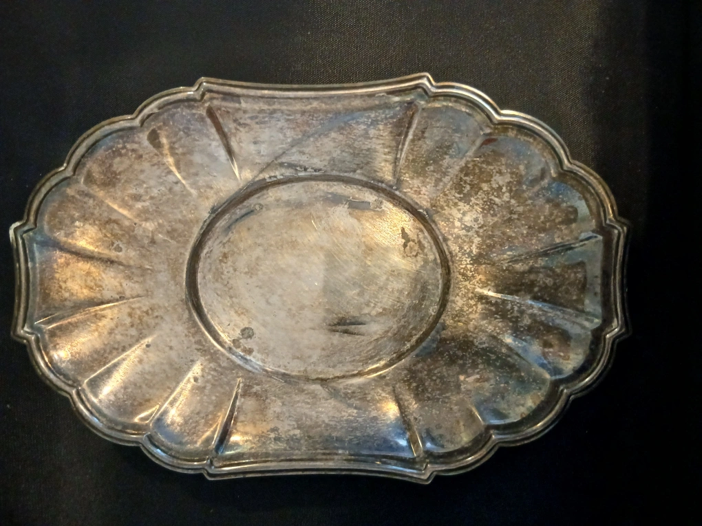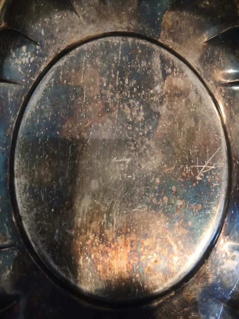 This is an antique silver-plated serving dish with a scalloped edge. It has a decorative, embossed design on the interior. It appears to be a piece from the Hastings company.