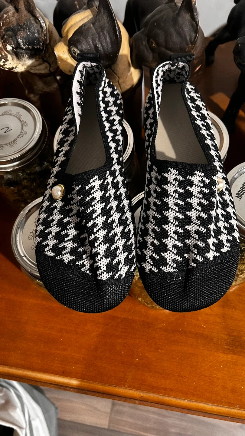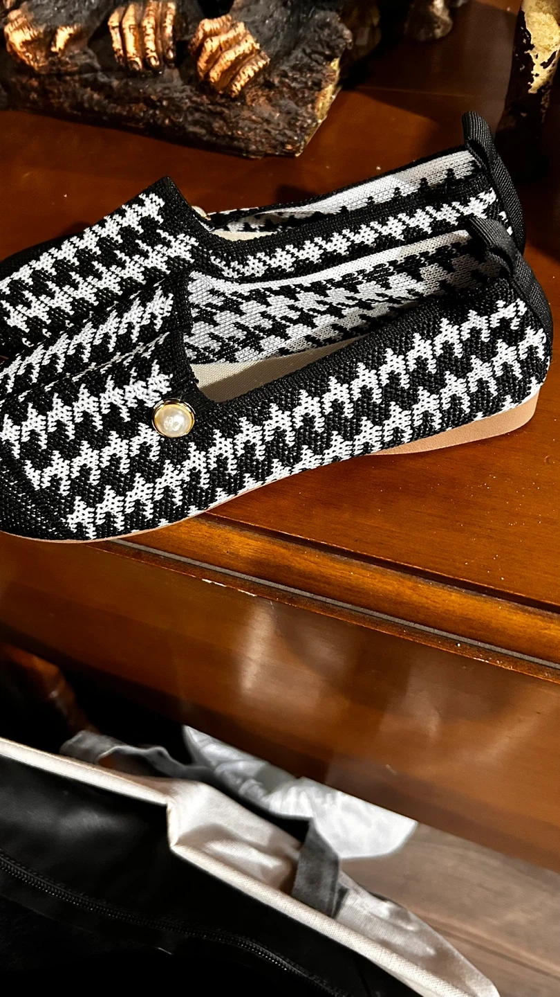 These black and white houndstooth knit flats feature a small pearl accent on each shoe. They appear to be slip-on style with a flexible knit upper and a flat sole. Perfect for casual wear or to add a touch of classic pattern to your outfit!