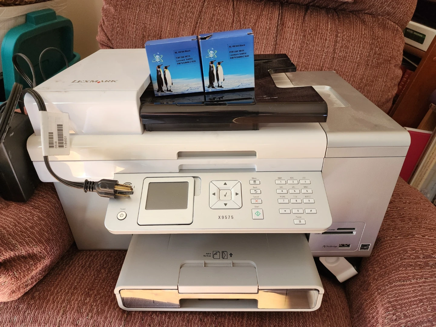 Lexmark X9575 all-in-one printer. Includes two NL-R0144 black ink cartridges. The printer has a colour display and card reader slots.
