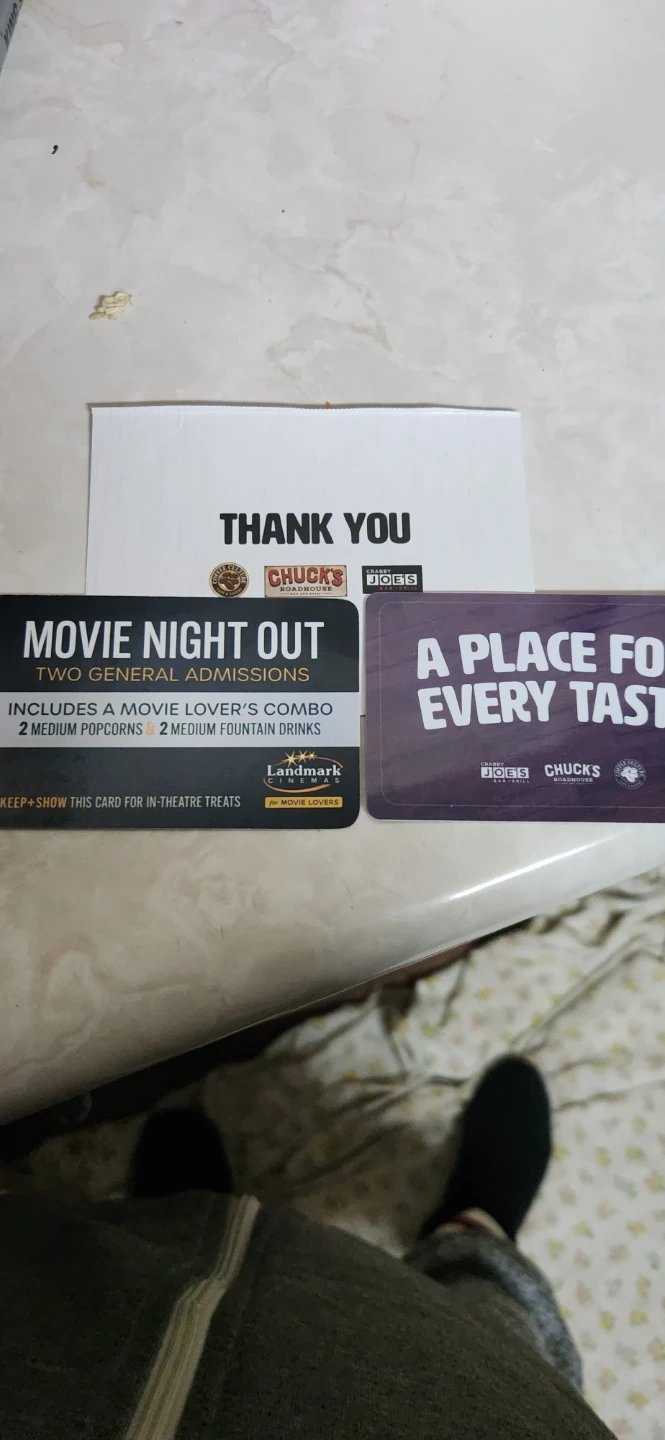 This is a $75 gift card for Chuck's Roadhouse. It's valid for all purchases. The card is activated and ready to use, a movie pass for two people get two popcorn and two drink go on valentine's day great taking your boyfriend or girlfriend or husband or wife or your family out for a date. no e transfer cash only pick up only thank you if you want meet at Tim Hortons on maple st and brock st north if you are interested please contact me