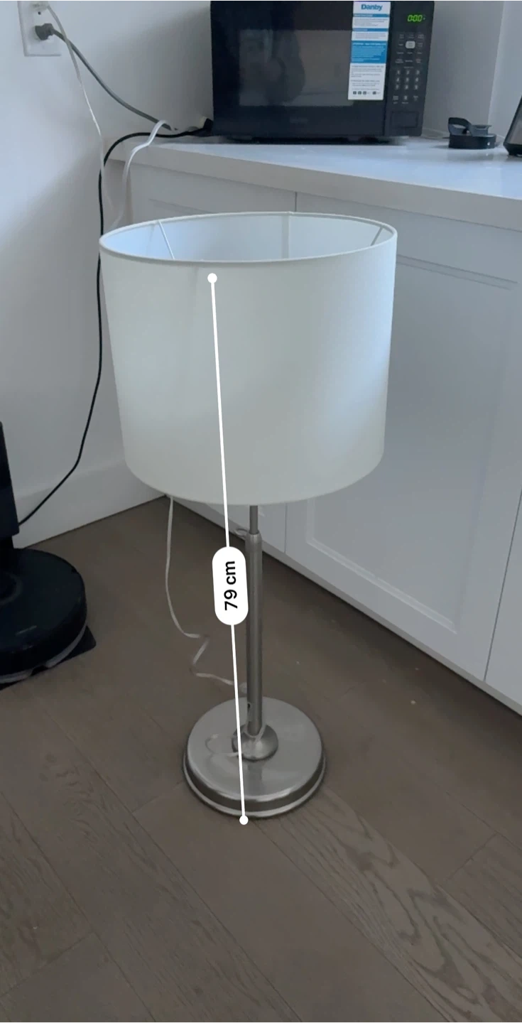 This floor lamp stands 79 cm tall and features a classic white fabric shade. Its brushed metal finish gives it a modern look. It's perfect for adding ambient lighting to any room.