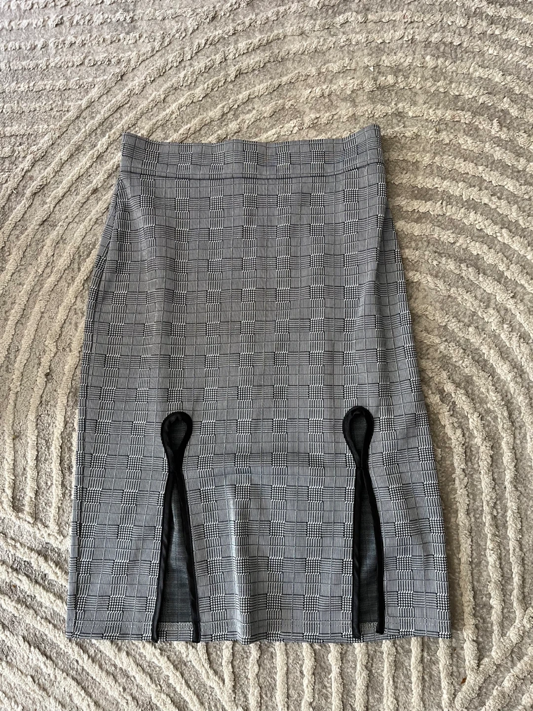 A stylish plaid pencil skirt featuring a black and white houndstooth pattern. It has two decorative black trim slits on the front. This skirt is a versatile addition to your wardrobe!