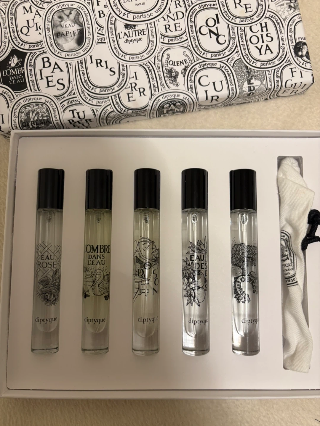 This Diptyque set features five miniature Eau de Toilette vials. Set Includes: Do Son, Eau des Sens, Philosykos, L'Ombre dans l'Eau, Eau Rose