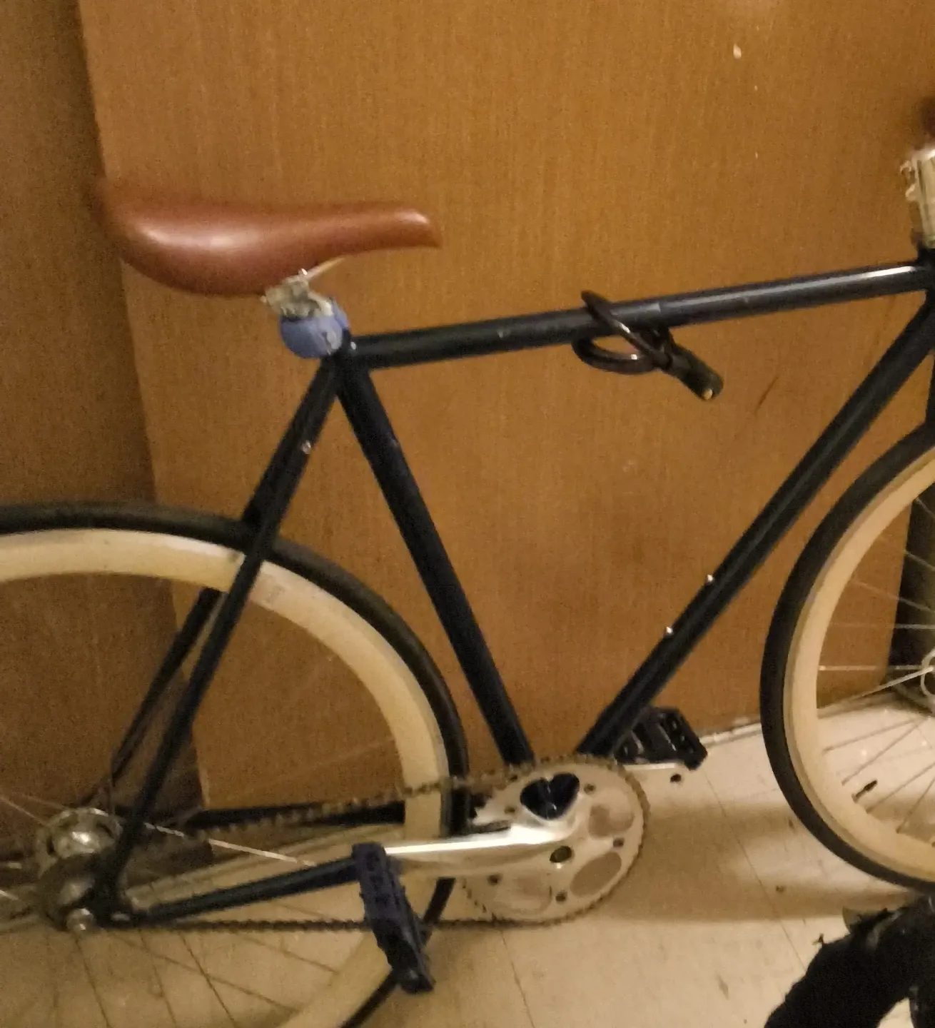 This is a dark blue bicycle with a brown seat and white rims. It has a single-speed drivetrain. Good for commuting or casual rides around town!