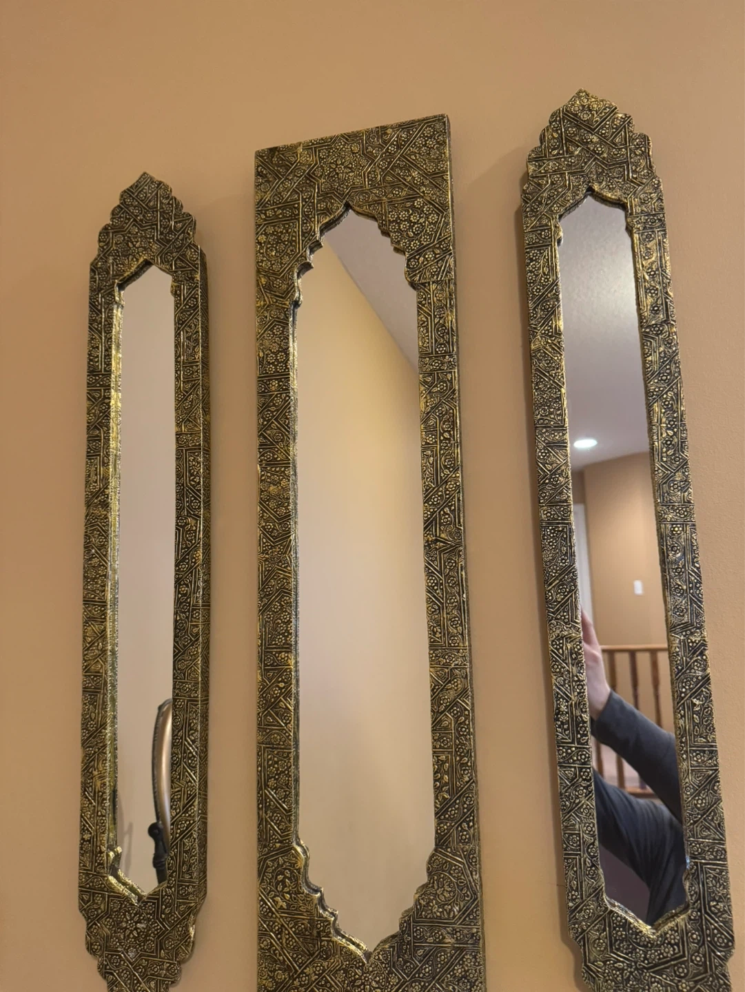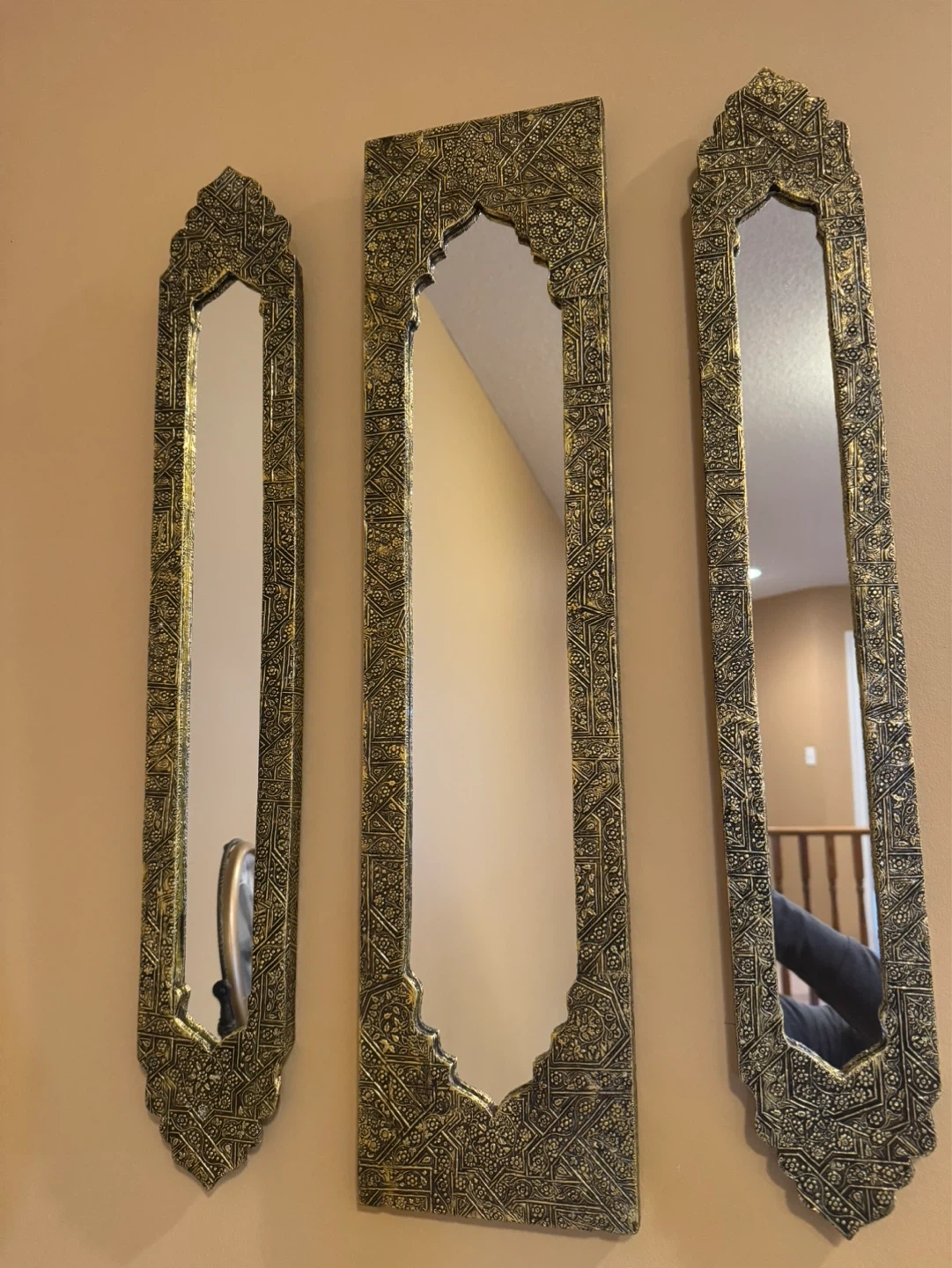 Gorgeous set of three decorative mirrors with intricate gold detailing. They're designed with a beautiful arch at the top. These ornate pieces add a touch of elegance to any room. They're perfect for a hallway or above a console table.