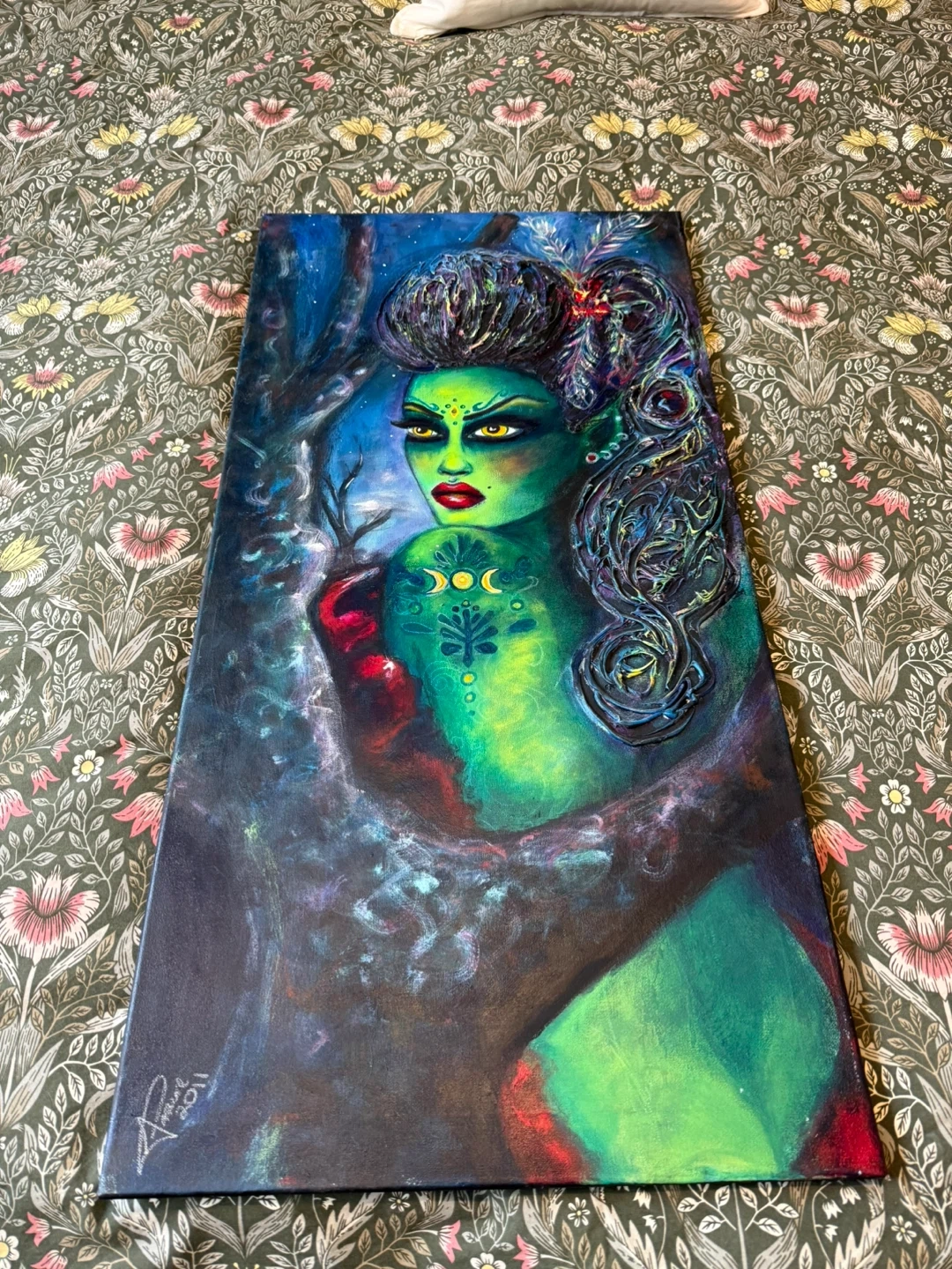 Unique, hand-painted canvas depicting a mystical green woman figure surrounded by dark foliage. The artwork features vibrant colours and detailed textures, signed by the artist in 2011. It's perfect for adding a touch of enchantment to your space! Paid $400