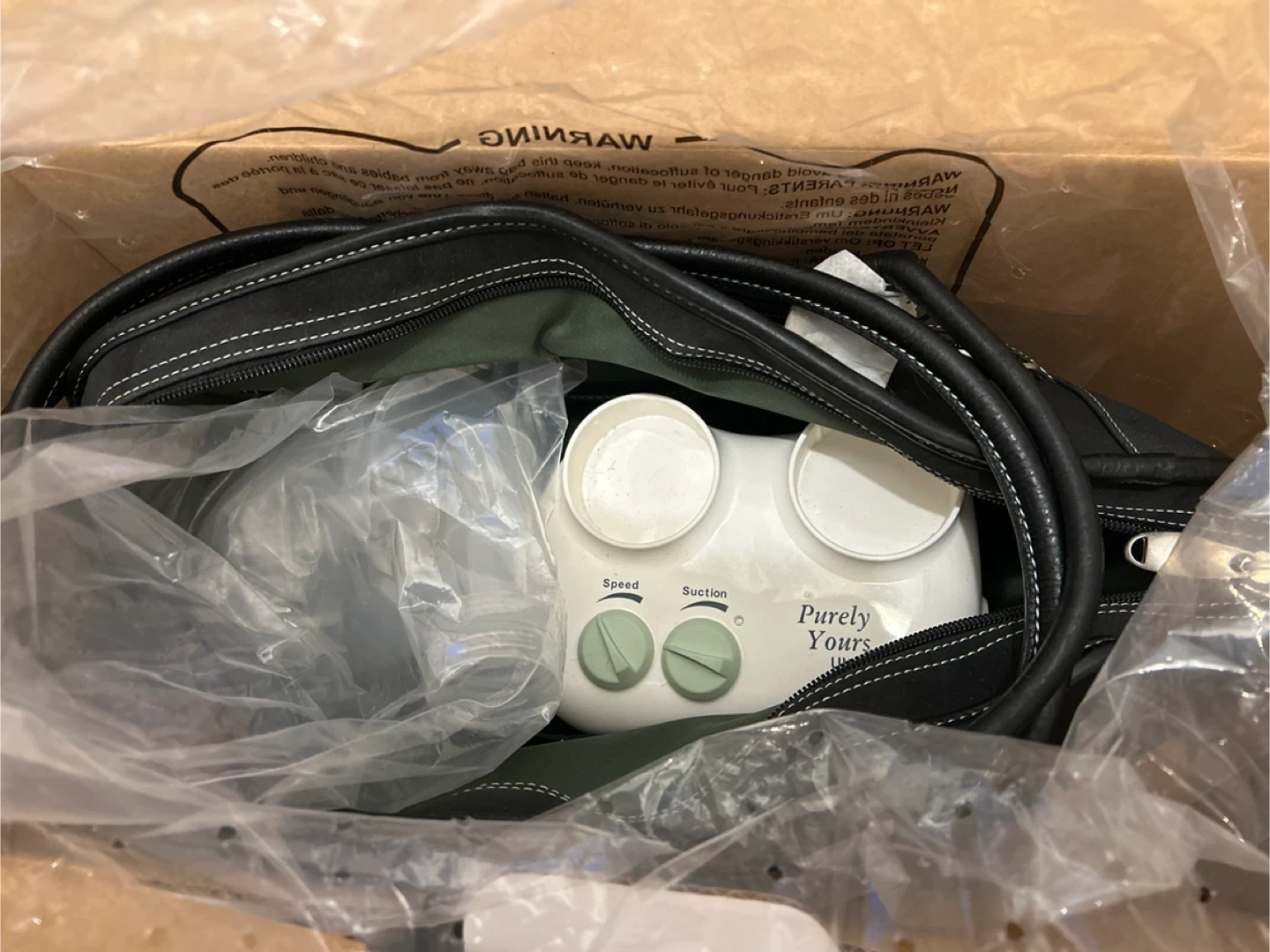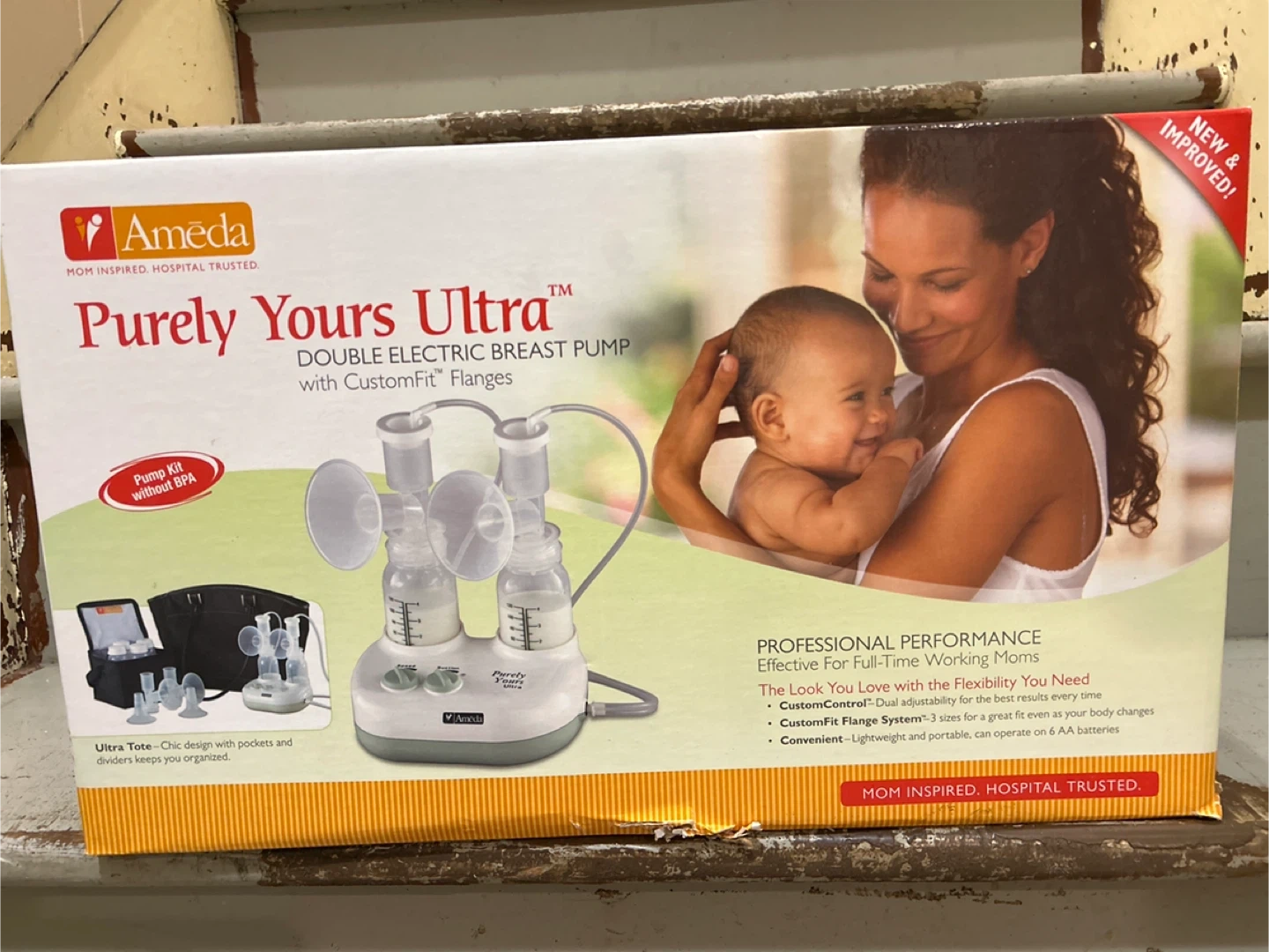 Ameda Purely Yours Ultra double electric *closed system* breast pump with CustomFit flanges. It's chic and includes a tote with pockets and dividers to keep things organized. The pump is lightweight and portable, operating on AA batteries or an AC adapter.