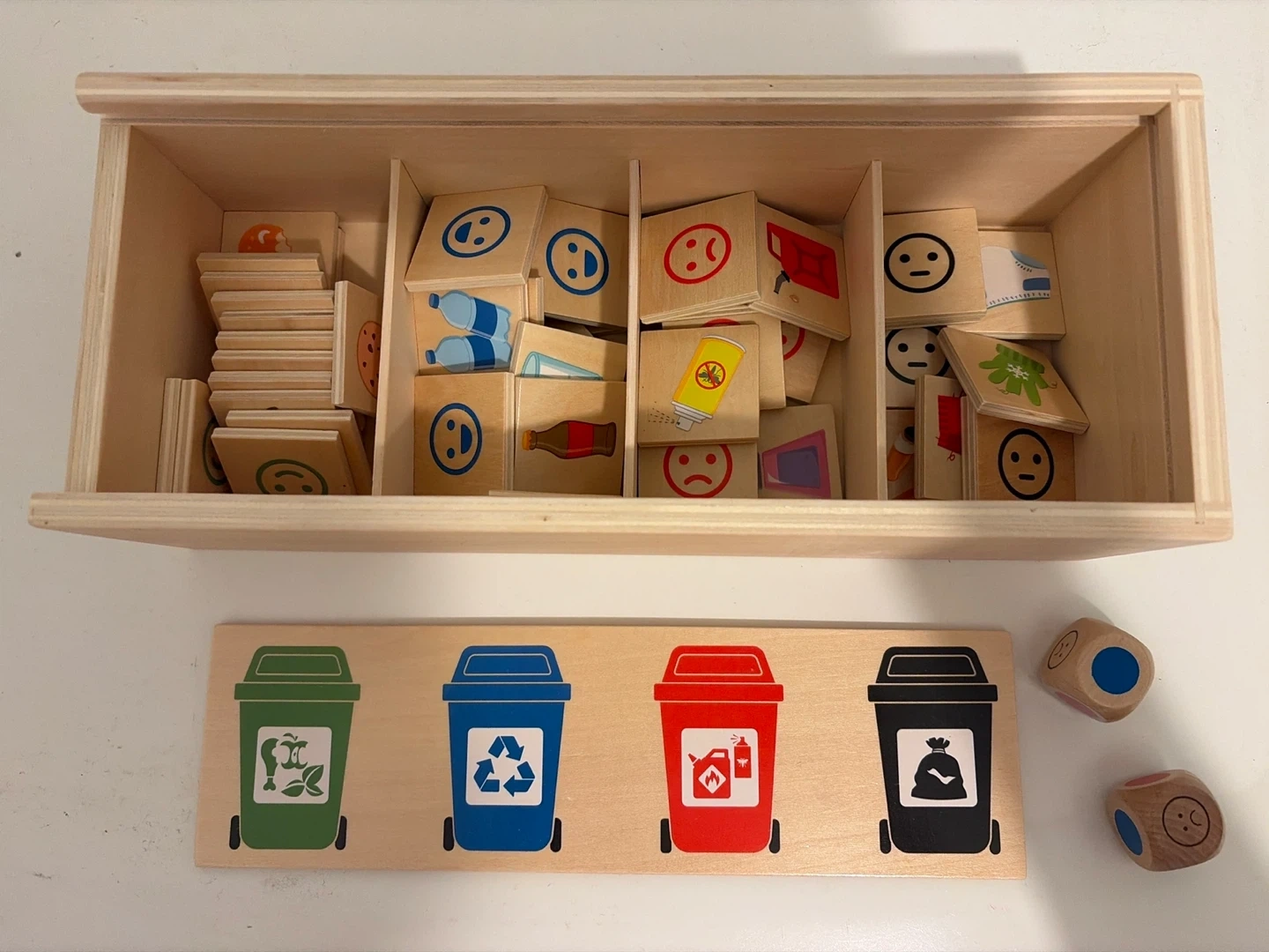 This wooden sorting toy includes four different coloured recycling bins and a set of tiles depicting various items to sort. It's a great way to teach kids about recycling! Comes with two dice featuring different sorting categories.