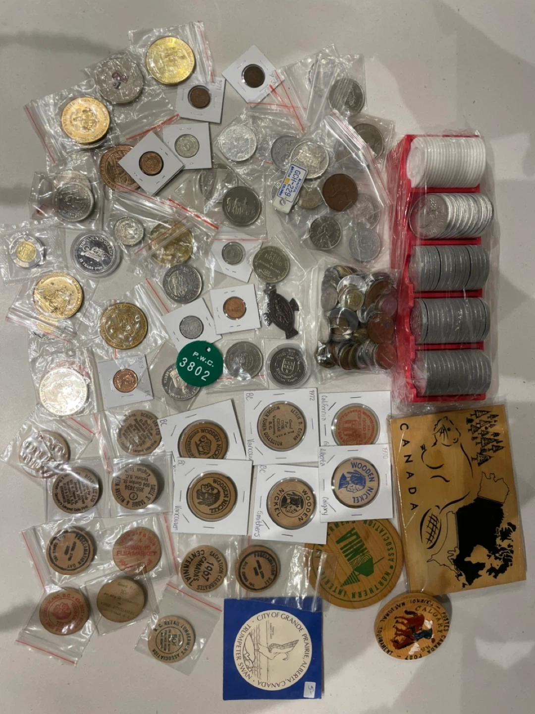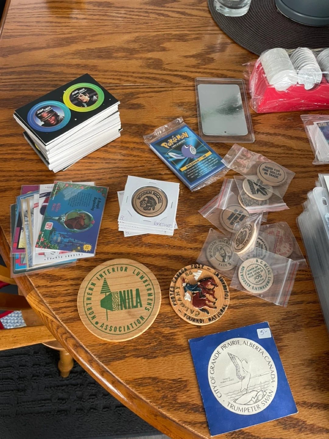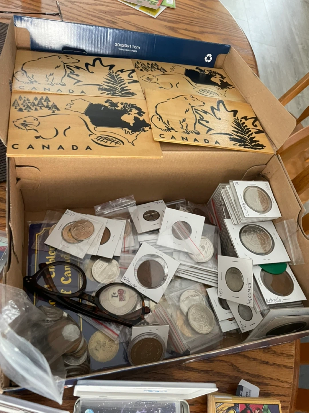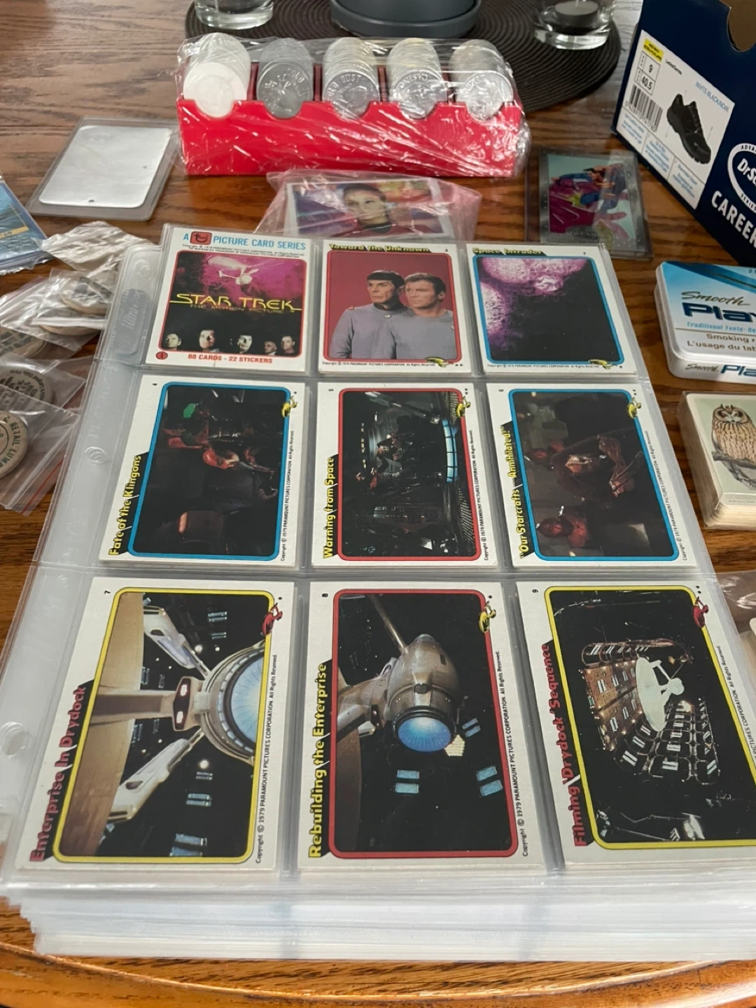 A mixed collection featuring various coins from different years and locations, alongside various Star Trek/Marvel/ Xmen trading cards sets. It’s a great find for collectors interested in numismatics and pop culture memorabilia.