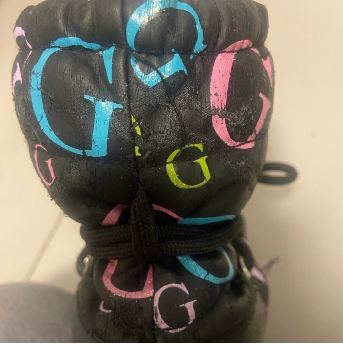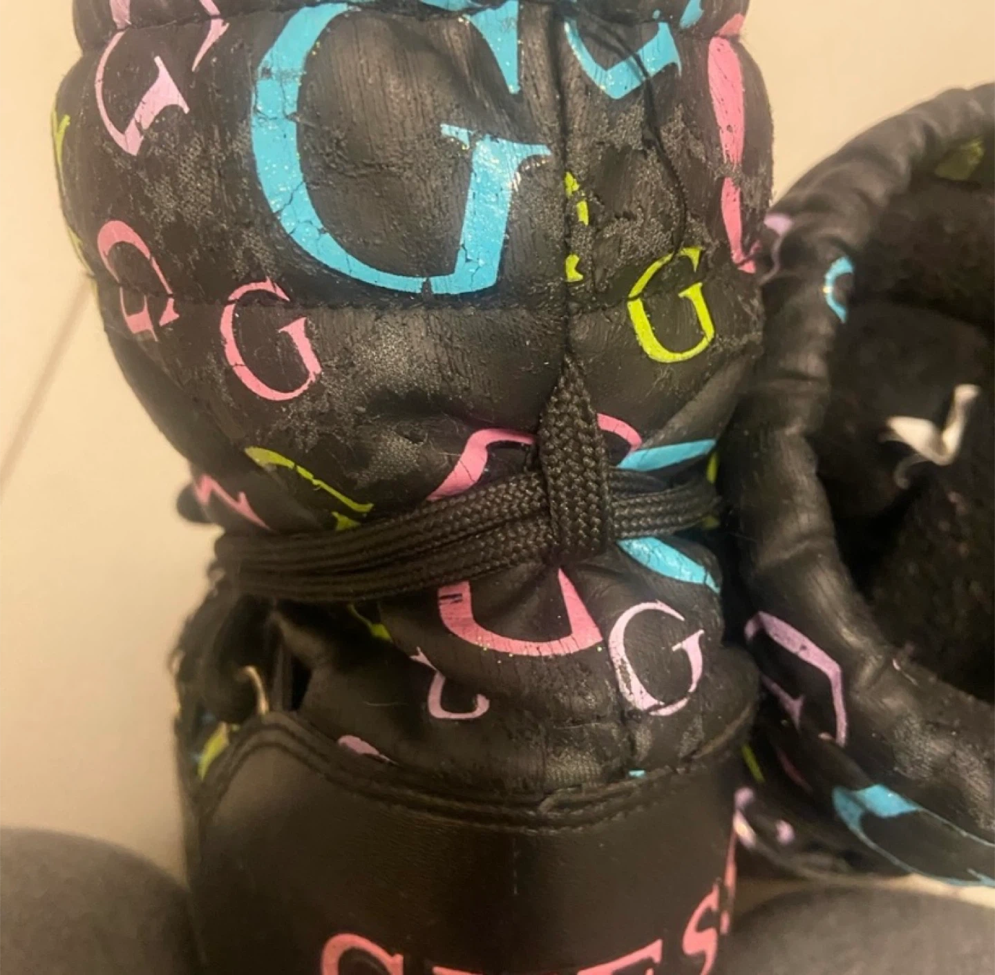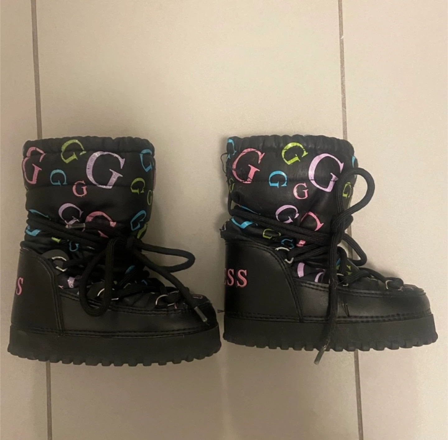 Cute pair of Guess toddlers winter boots! They are black with the Guess logo printed all over. Perfect for keeping your baby girls feet warm and stylish during the colder months.