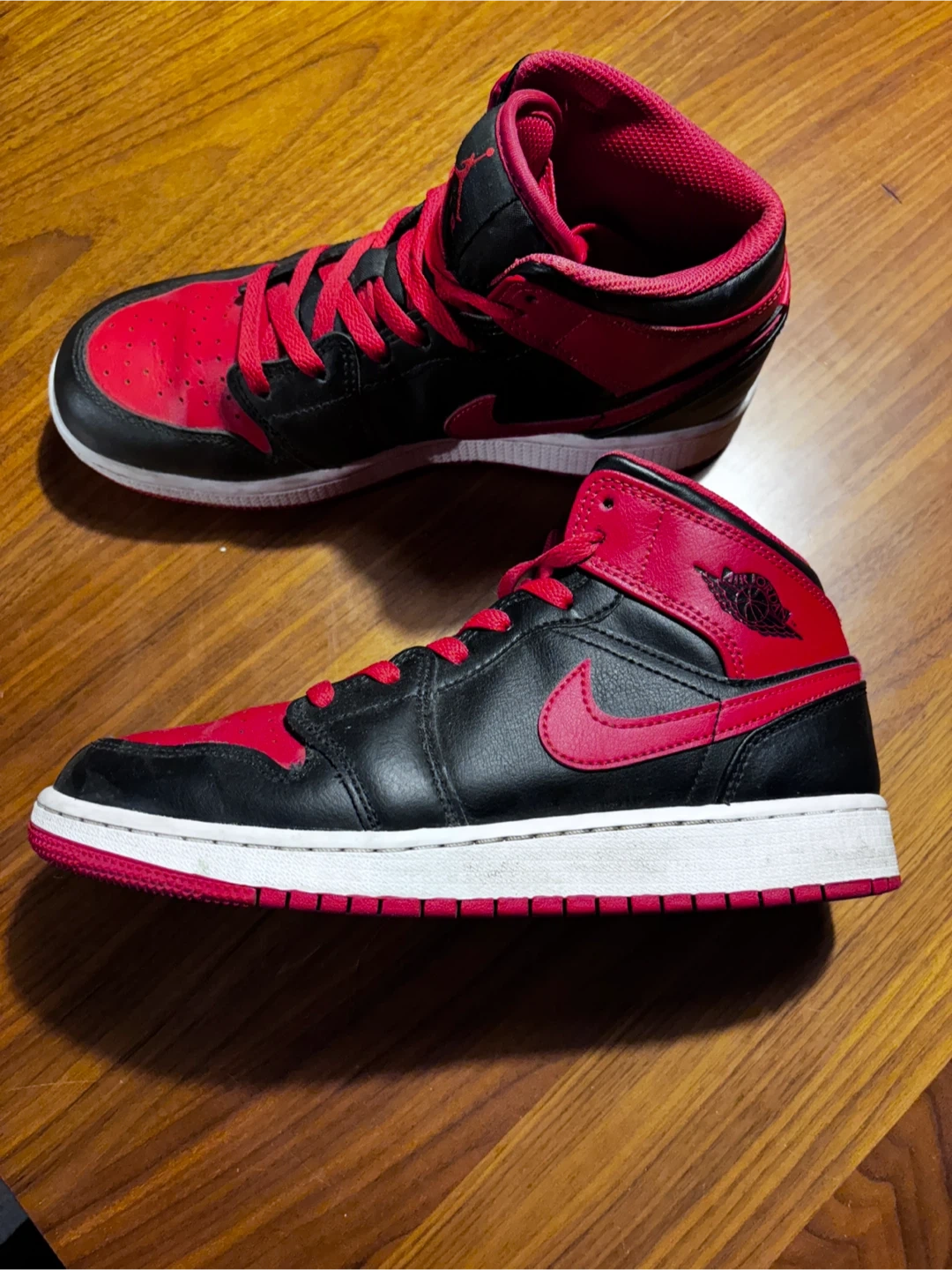 These are youth Air Jordan 1 Mid SE sneakers in a black and red colourway. They're a US kids' size 6Y. Pick up in North Oshawa