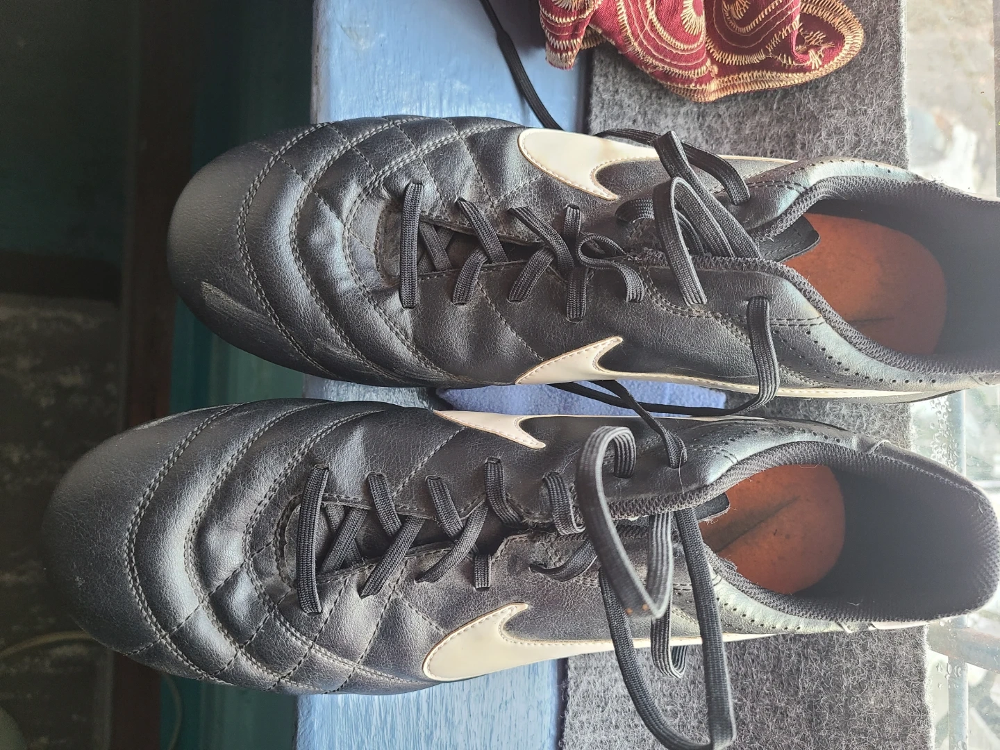 Nike Tiempo soccer cleats in black and white. These cleats are made in Vietnam and feature orange studs for traction. Size is 13 US