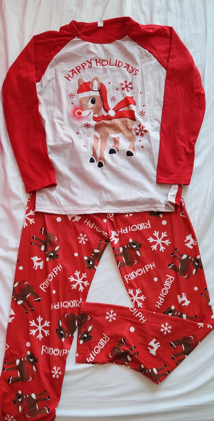 Comfy Rudolph the Reindeer pyjama set for kids. Features a 'Happy Holidays' graphic and Rudolph pattern. Size 13-14T.