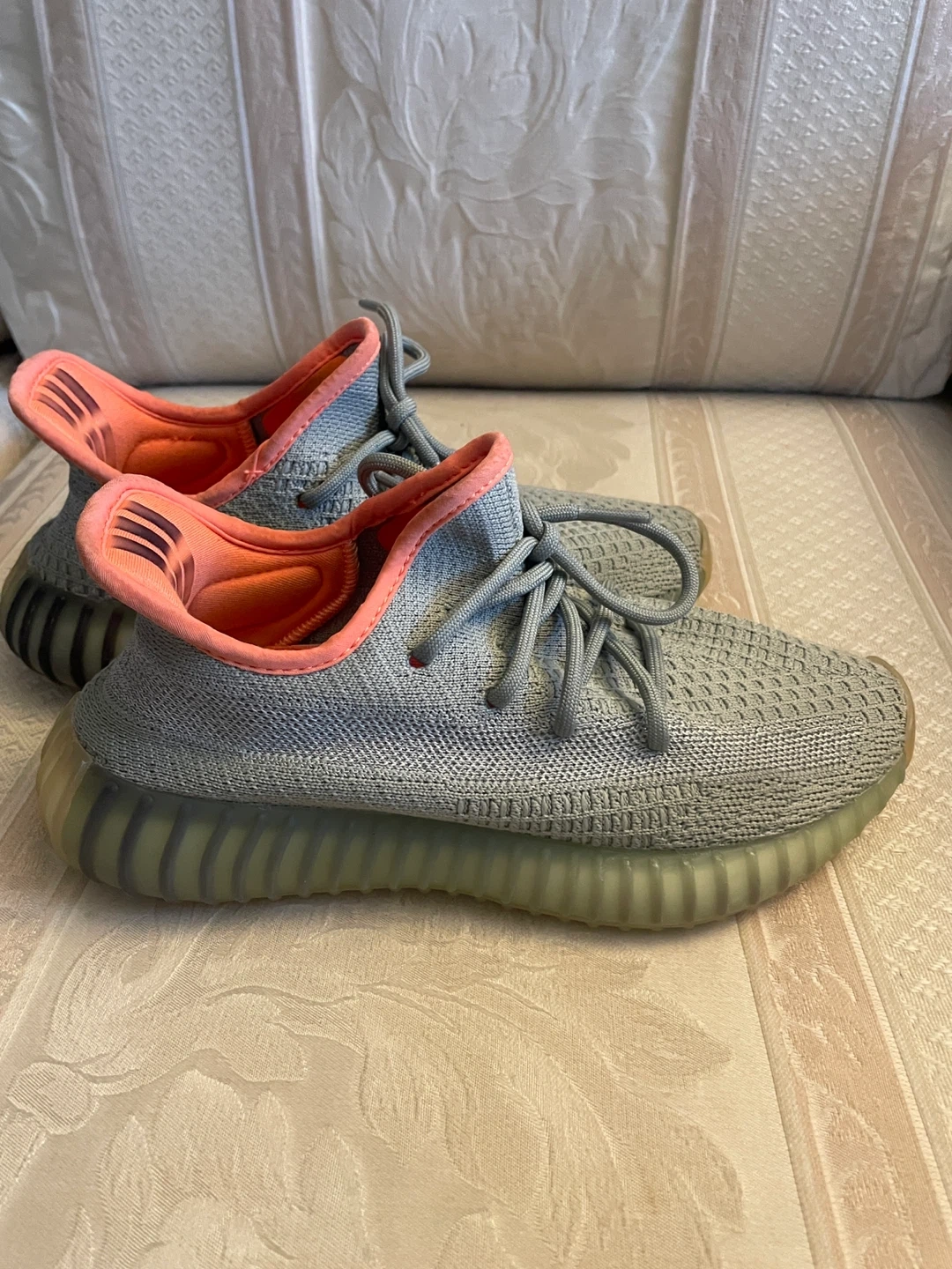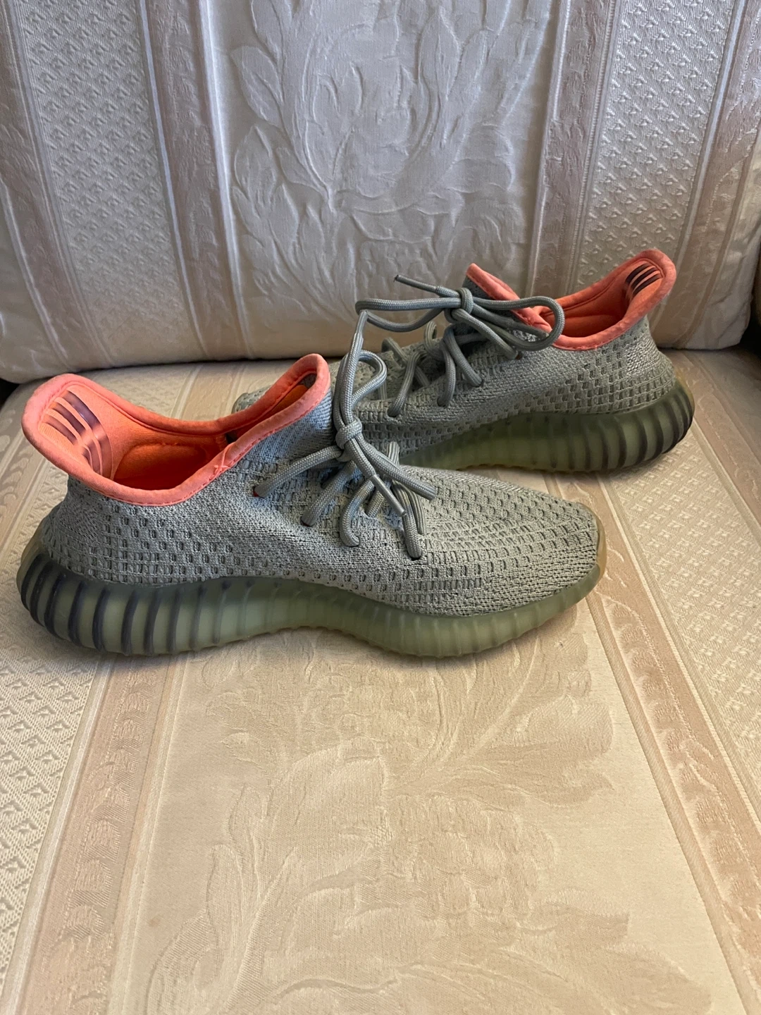 Grey knit sneakers with pink accents. These Yeezy Boost 350 V2s have a comfortable Primeknit upper and a cushioned midsole. Size is not specified.