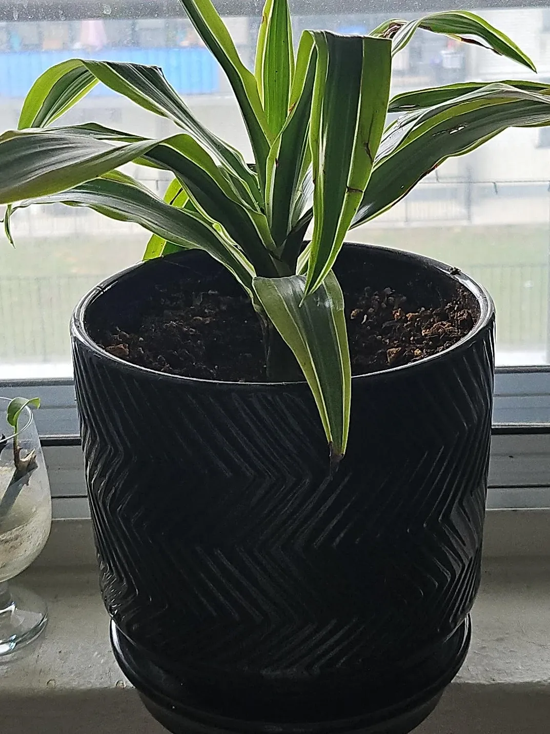 This is a Dracaena plant with variegated green and yellow leaves. It's potted in a stylish black ceramic pot featuring a chevron pattern. The pot includes a matching saucer. This plant adds a touch of modern greenery to any space!