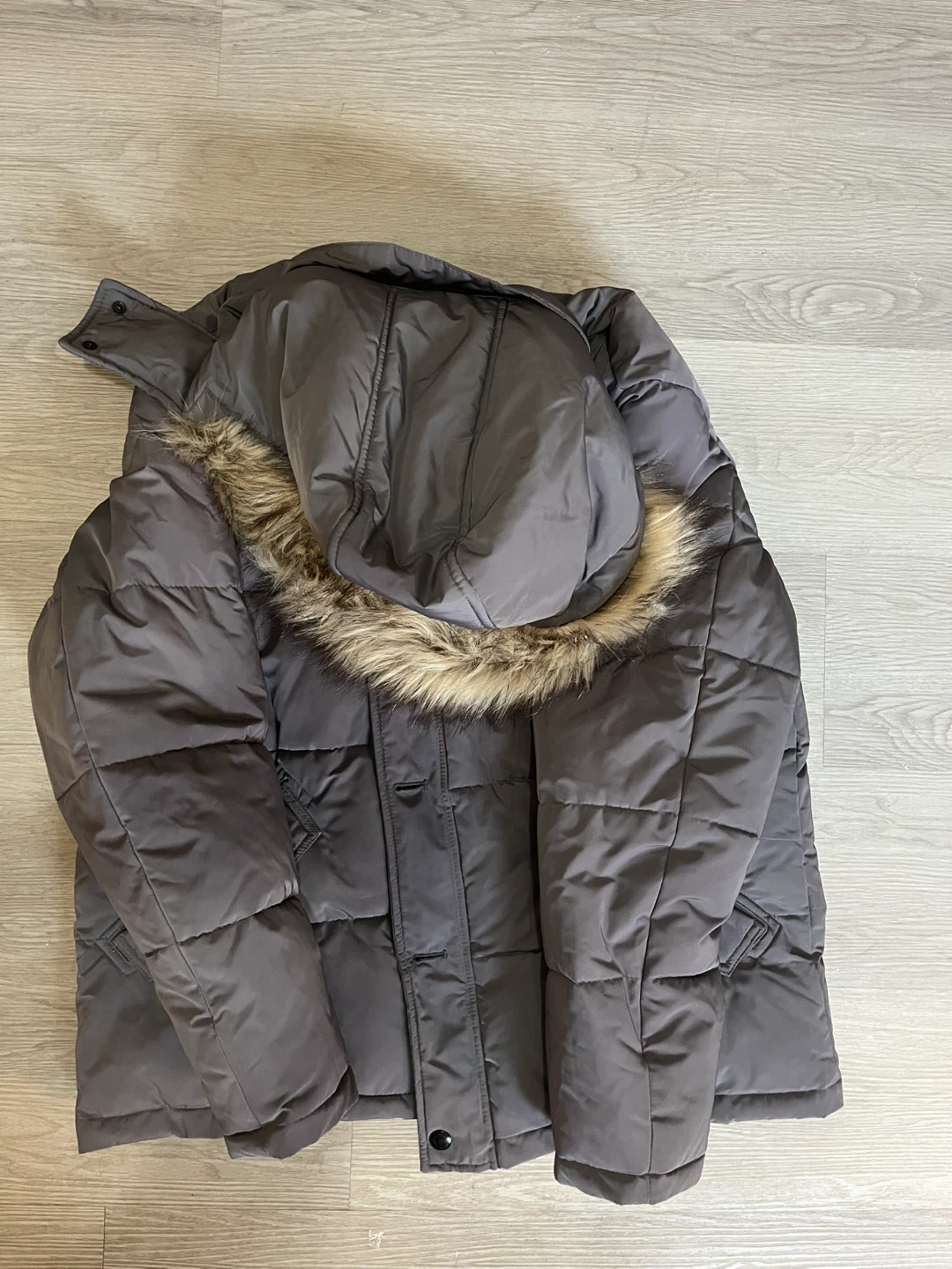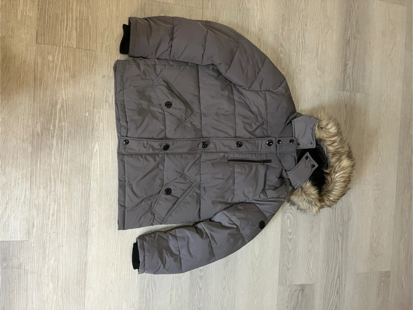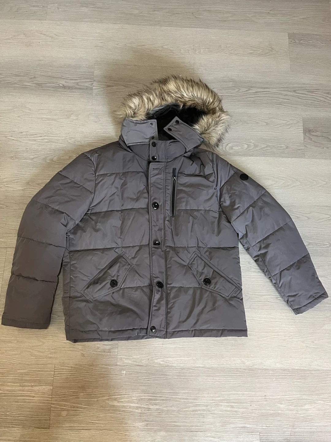 Selling a Calvin Klein puffer jacket in a lovely grey colour! It's a size large and features a faux fur hood trim.