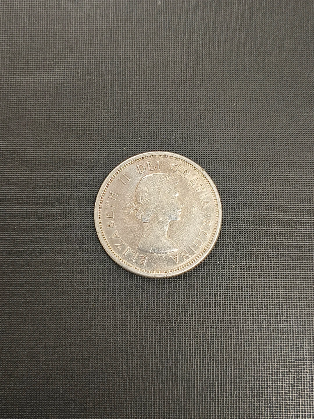 Selling a Canadian quarter from 1965! It features Queen Elizabeth II on one side and a caribou on the other. A great piece for collectors!
