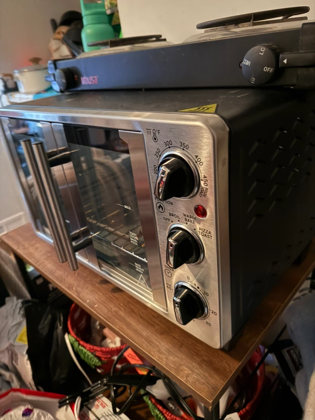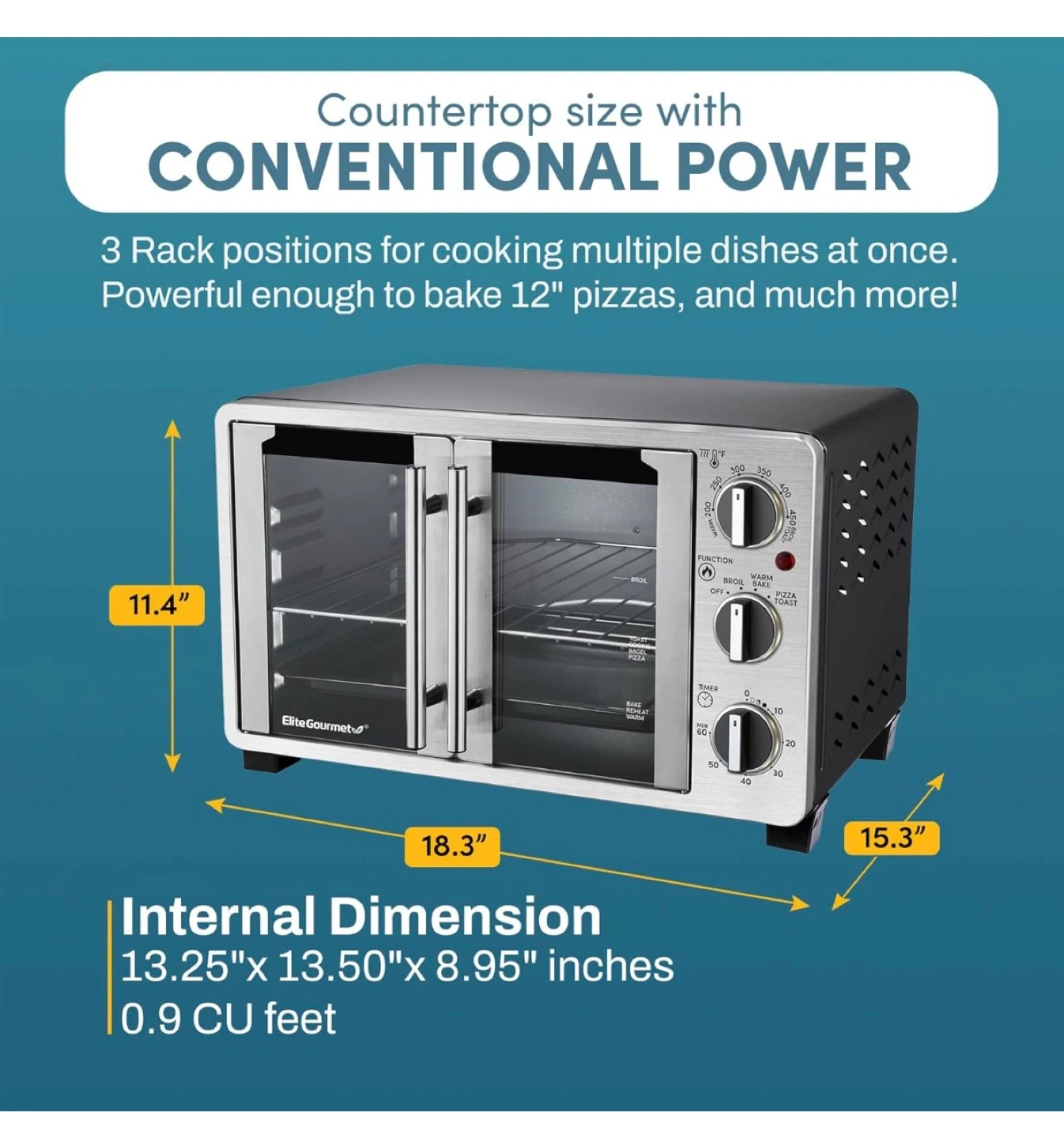 This Elite Gourmet countertop oven is perfect for baking pizzas up to 12 inches and much more! It features three rack positions, allowing you to cook multiple dishes at once. The internal dimensions are 13.25" x 13.50" x 8.95" inches, with a capacity of 0.9 cu feet. It's countertop size with conventional power!