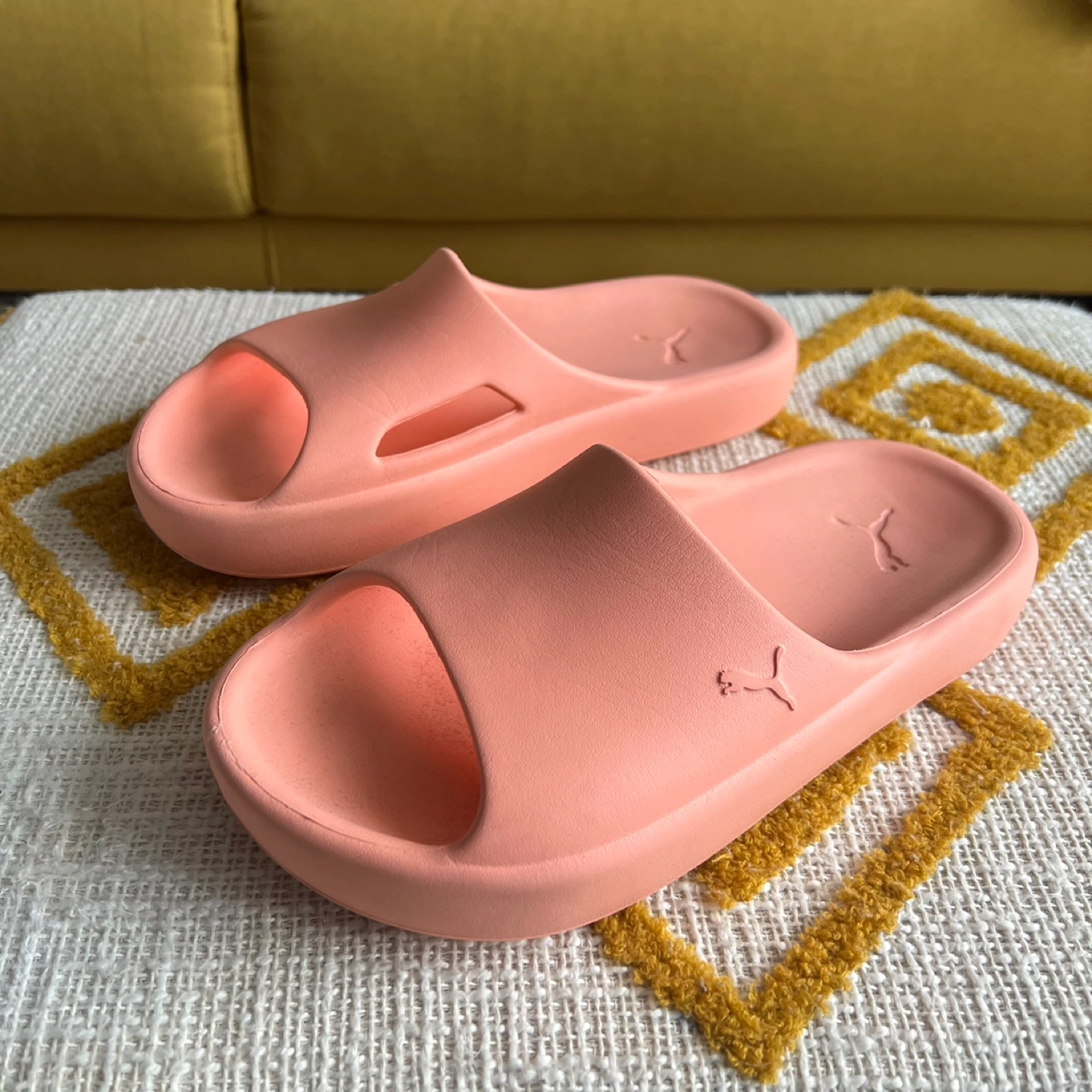 Pair of peach-coloured Puma slides. Comfortable and easy to wear. Nice and cushioned. Great for summer and using around the house as slippers.
