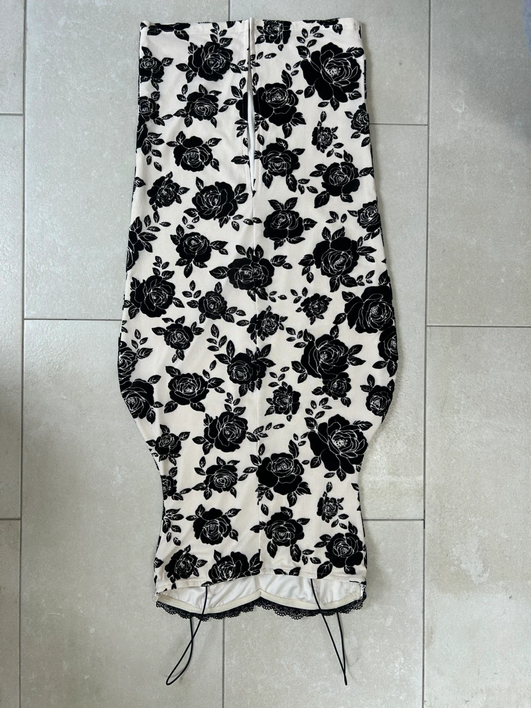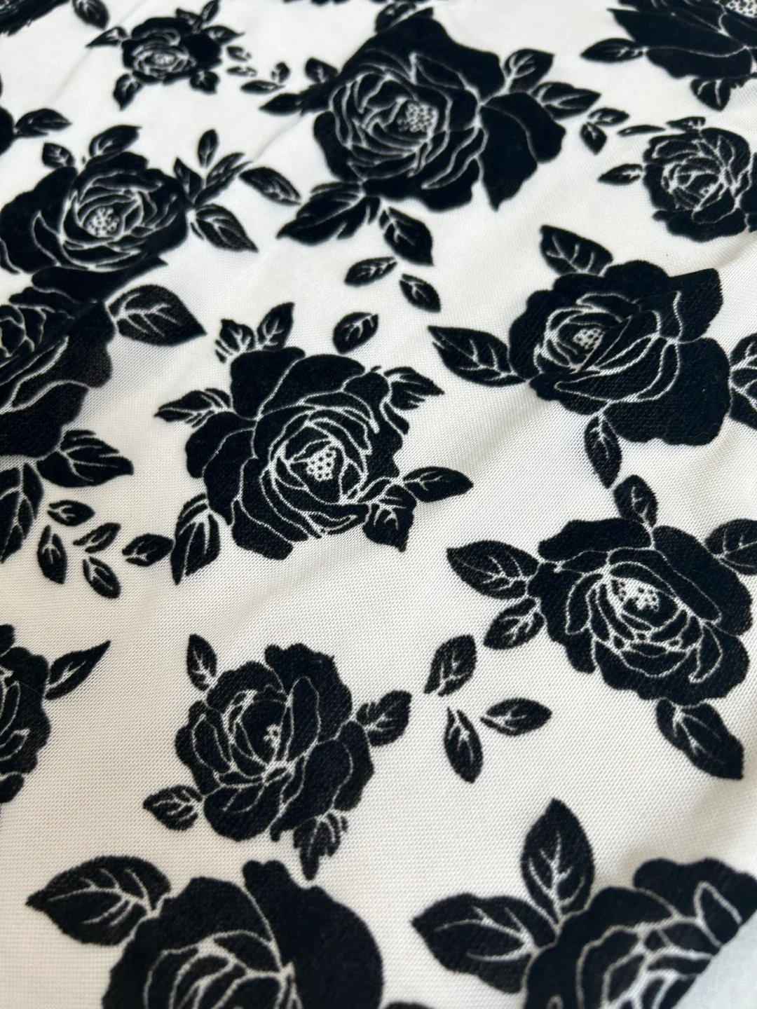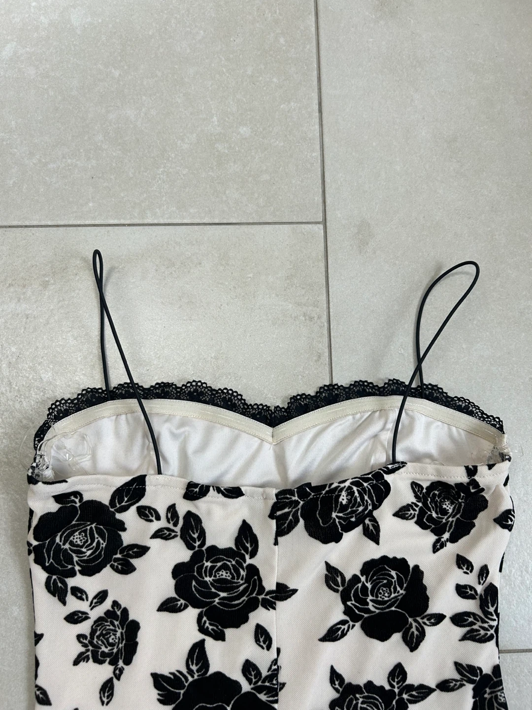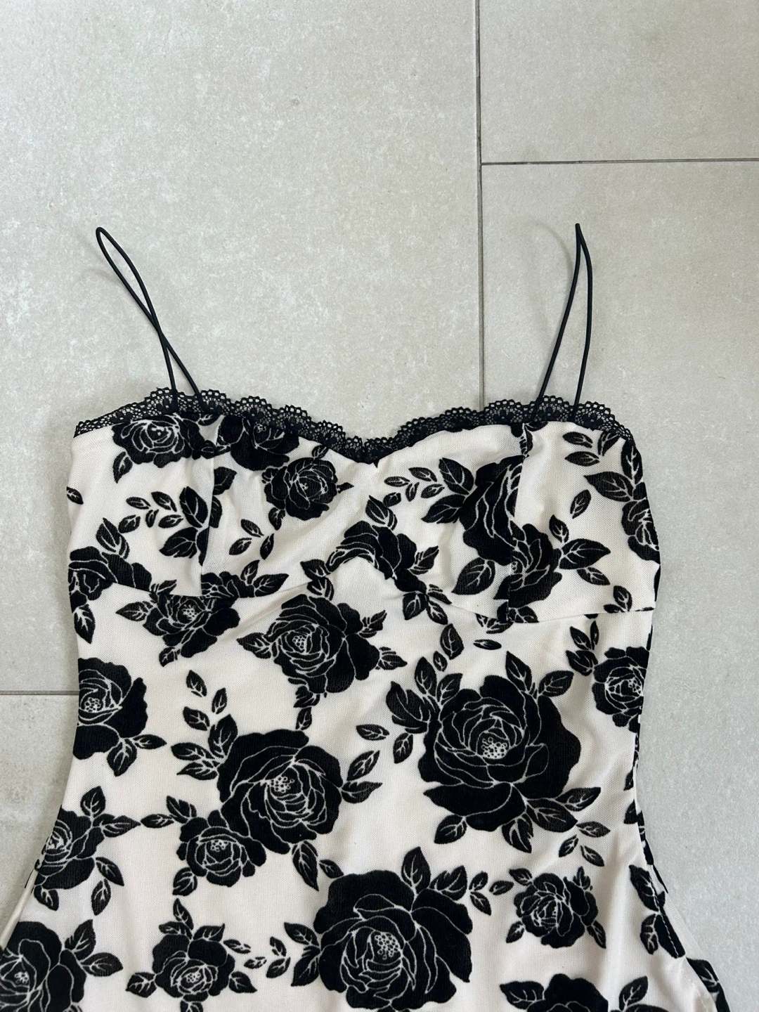A fitted cream dress featuring a bold black rose print throughout. It has delicate spaghetti straps and lace trim along the neckline. This is a stylish option for an evening out!