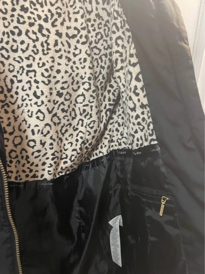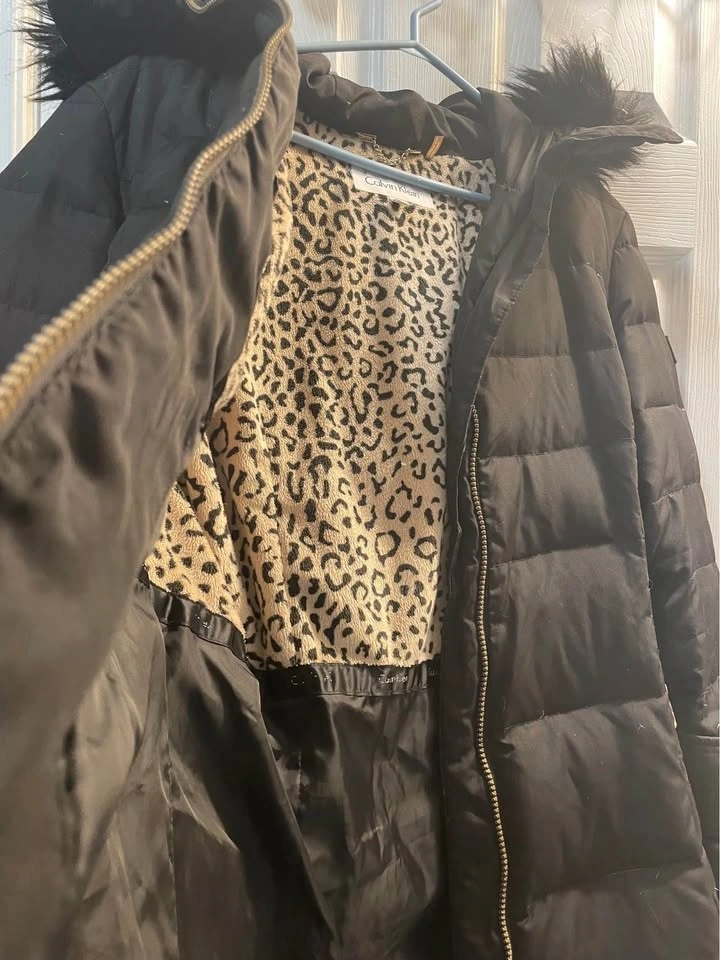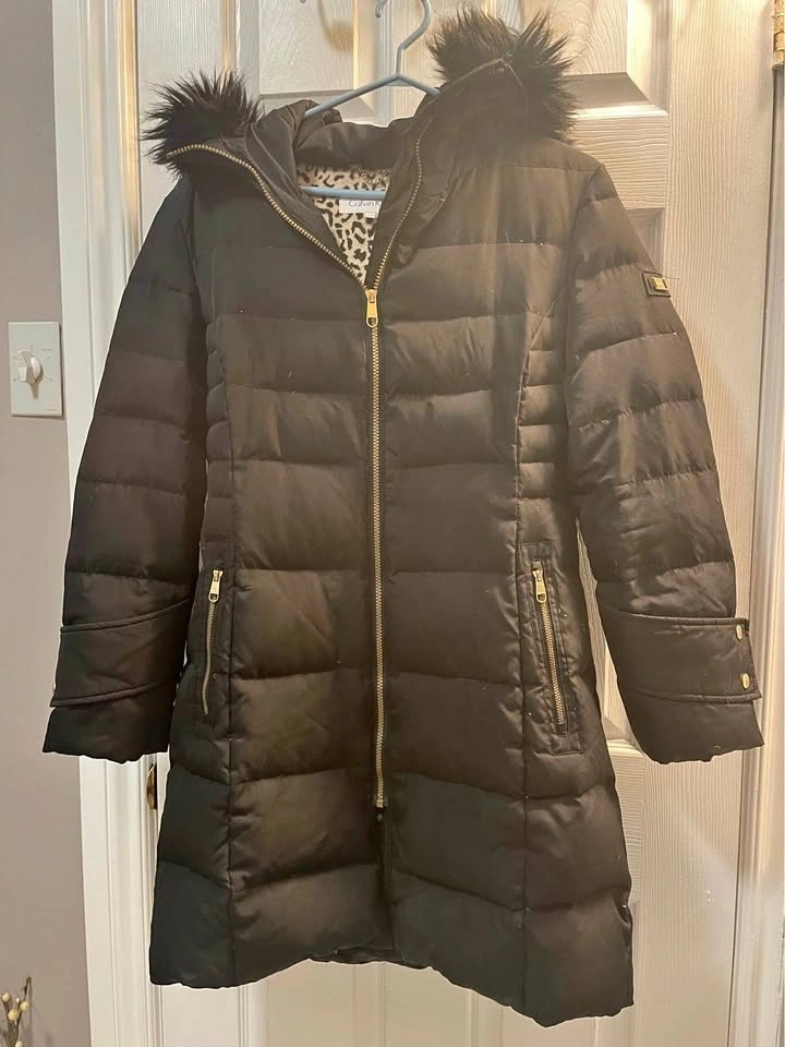 Calvin Klein winter jacket with removable fur trim on the hood. It was just cleaned. This size Medium jacket has down feathers and all zippers work well. Includes deep side zipper pockets and 2 inside pockets.