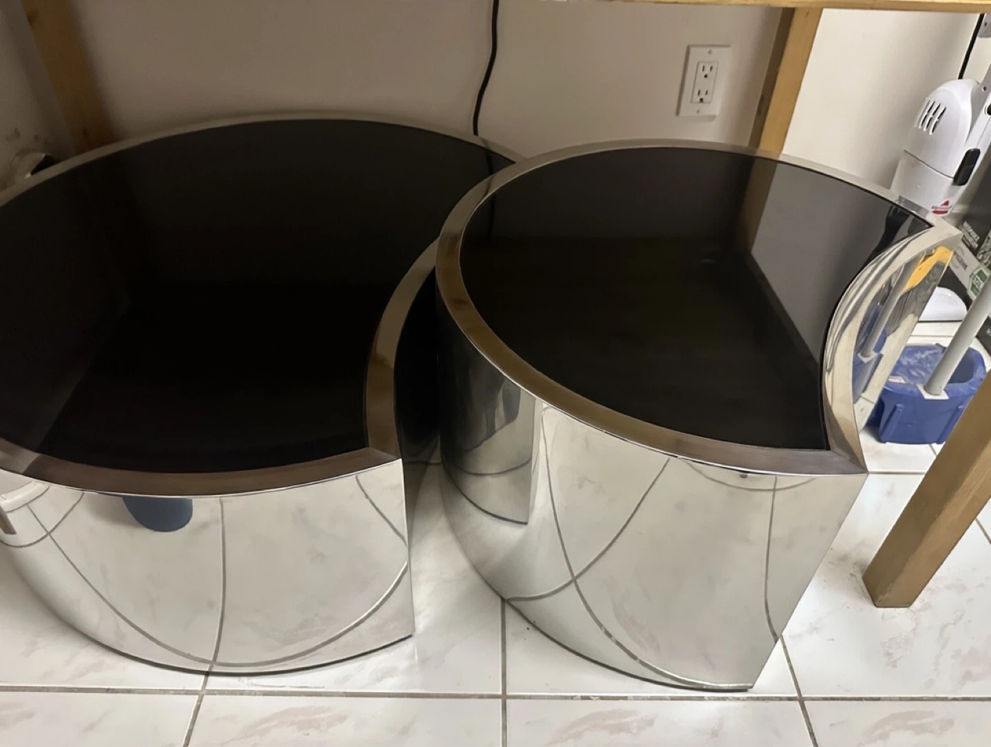 A set of two unique curved coffee tables with shiny chrome bases and black tops. These tables will add a modern touch to any living space! Table tops are a glossy black material.