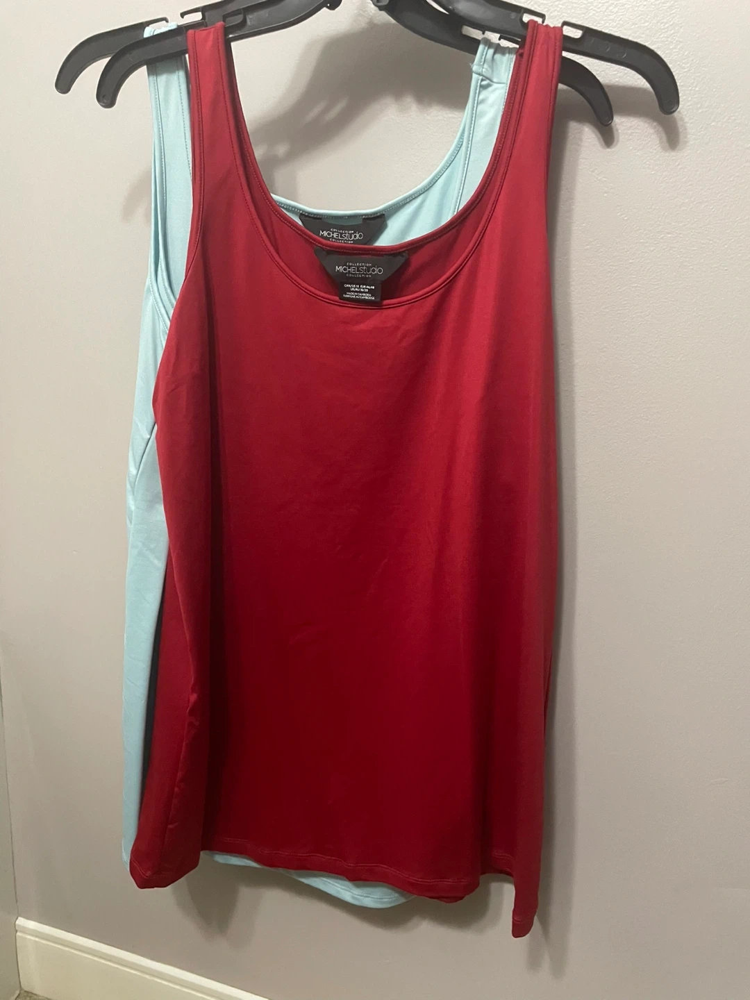 Selling 2 tank tops from Michel Studio Collection, one in red and one in light blue. Size 1X (CAN/US). Made in Cambodia. This pack includes two versatile tank tops.