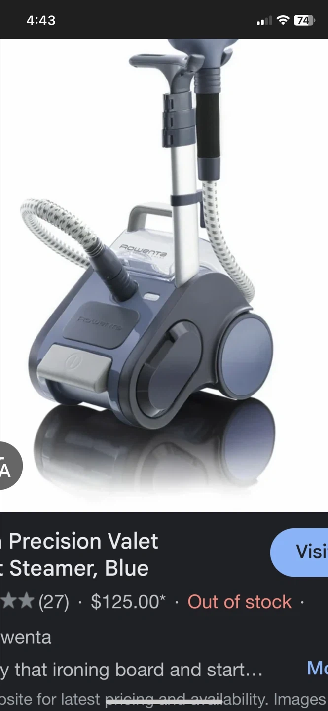 This Rowenta Precision Valet IS9050Q1 garment steamer comes in blue. It's designed for efficient wrinkle removal. It features a removable water tank and a steam trigger for controlled steam release.